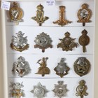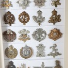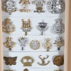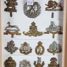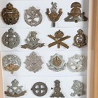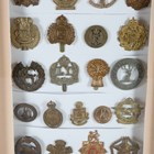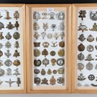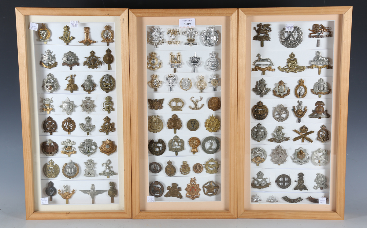 A large collection of 20th century British and other regimental cap badges, including Tanks Corps, Women's Transport Service, Army Cyclist Corps, Lovat Scouts and 15th North Auckland, displayed within three modern glazed frames.