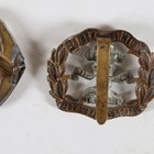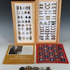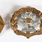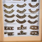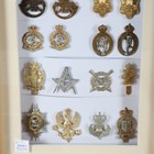 A collection of British army cap, shoulder and collar badges, including Royal Sussex, Lancashire, Prince of Wales's Volunteers and Devon and Dorset, displayed within two modern glazed frames, together with a small group of loose cap badges, a German steel souvenir cross, dated 1914, and a group of facsimile copy collectors' cap badges, within a presentation folder.