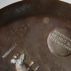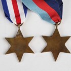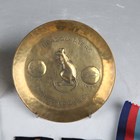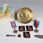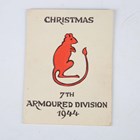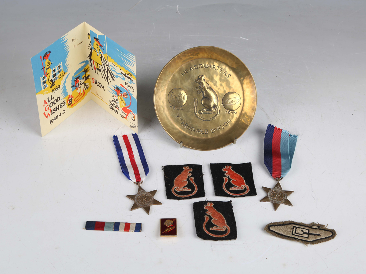 A small group of military items relating to the Desert Rats, including a 7th Armoured Division trench art brass tray by Helmut Scheel, detailed to the centre with a rat and dated '1944 1946', a 7th Armoured Division Christmas card, dated 1944, inscribed inside 'To Mum, Eric', three Desert Rat embroidered cloth military insignia and two Second World War period medals, comprising 1939-45 Star and France and Germany Star.