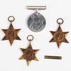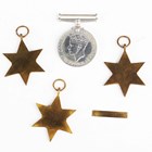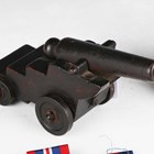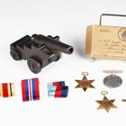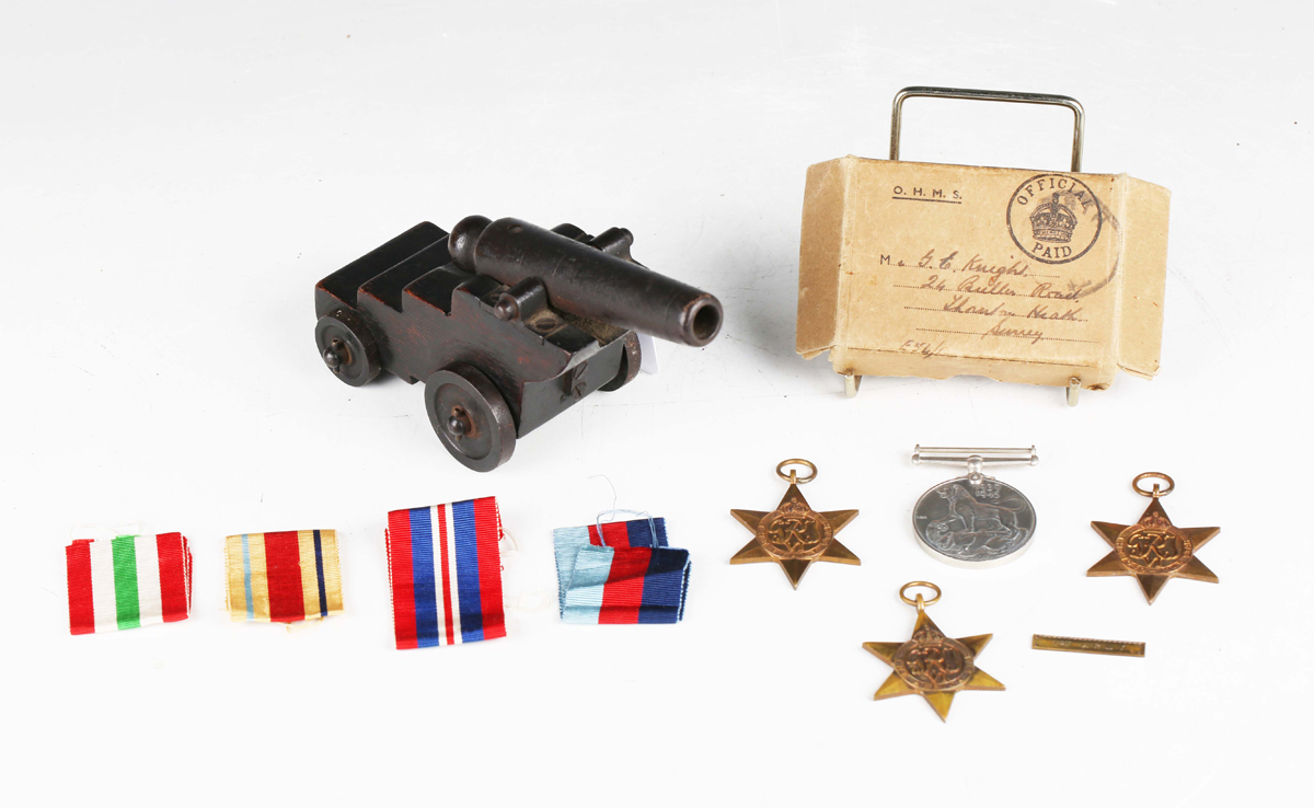 A 19th century cast bronze toy cannon, the barrel marked 'D.G. 1893', supported on a stepped wooden gun carriage with cast steel wheels, length 15cm, together with a group of four Second World War period medals, comprising 1939-45 Star, Africa Star with bar '1st Army', Italy Star and War Medal, with Army Council forwarding slip and box of postage, addressed to 'G.E. Knight, 24 Buller Road, Thornton Heath, Surrey'.