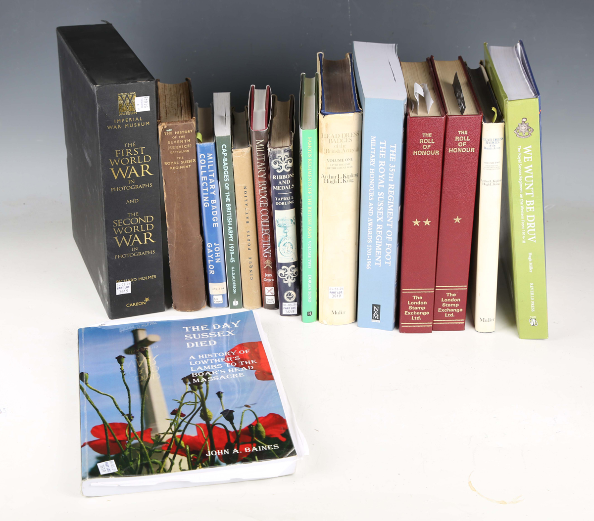 A collection of military badge and other military related reference books, including two volumes of de Ruvigny's 'The Roll of Honour, A Biographical Record of Members of His Majesty's Naval and Military Forces Who fell in the Great War 1914-18', Vol I, Part I, and Vol II, Part III, limited edition No. 95/100, published by the London Stamp Exchange, and 'Head-Dress Badges of the British Army' by Arthur L. Kipling & Hugh L. King, second edition 1978, signed to title page.