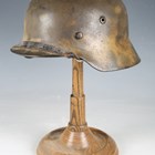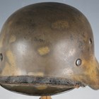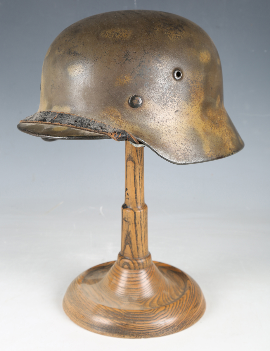A German M35 single-decal combat helmet, the body with green and brown painted camouflage, with leather lined interior and white metal fitted chin strap, the interior body stamped '1035'.
