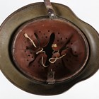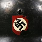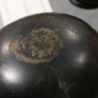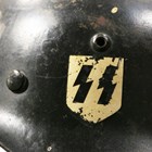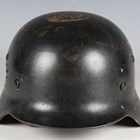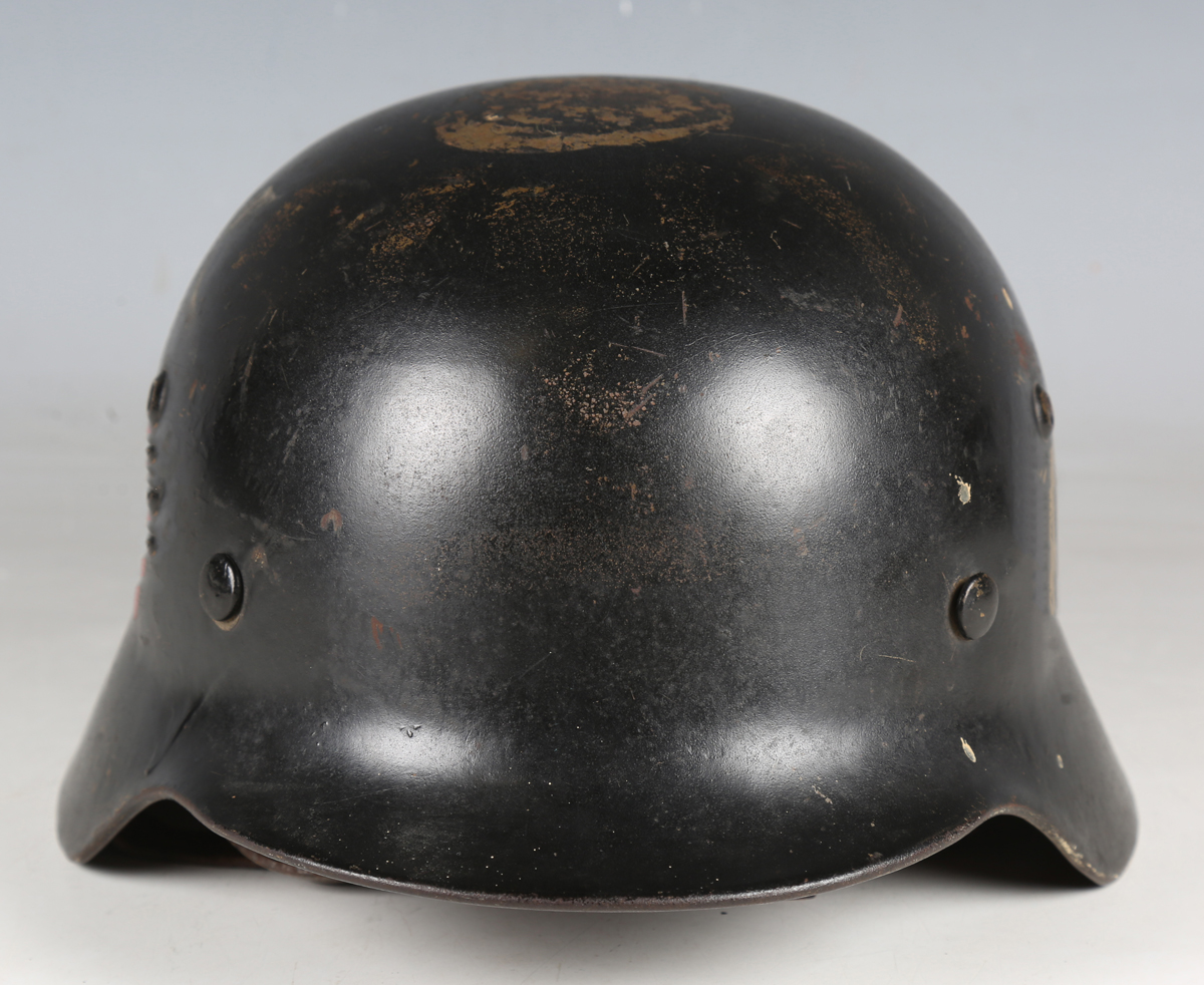 A German M35 double-decal combat helmet with black painted body, leather lined interior and chin strap, the interior body stamped '723'.