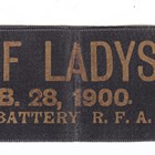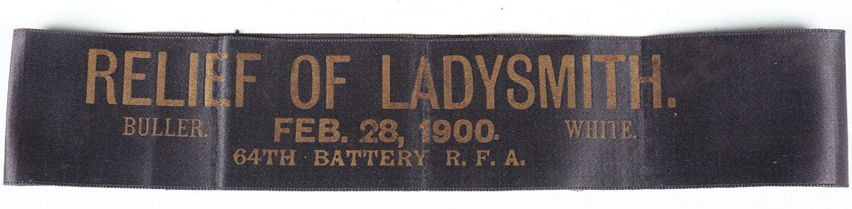A rare Boer War period Relief of Ladysmith charity flag-seller's black/blue silk armband, detailed in embossed gilt 'Relief of Ladysmith. Buller. Feb. 28 1900. White. 64th Battery R.F.A.', length 57cm.