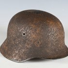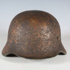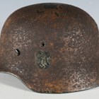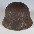 A Second World War period German M35 steel combat helmet, the body with unusual textured camouflage finish and part single decal, with later leather interior lining.
