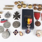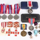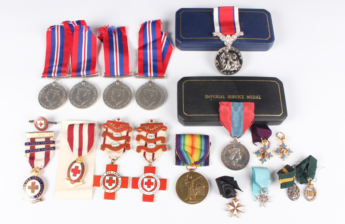 A collection of medals and badges, including five British Red Cross Society awards, four 1939-45 War Medals, a 1914-19 Victory Medal to ‘Capt.V.Howel’, various dress miniature medals, two cap badges, an Imperial Service Medal, Elizabeth II issue, to ‘Edward Bell’, with original case, and a quantity of uniform buttons and badges.