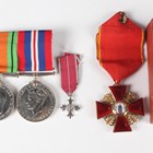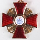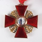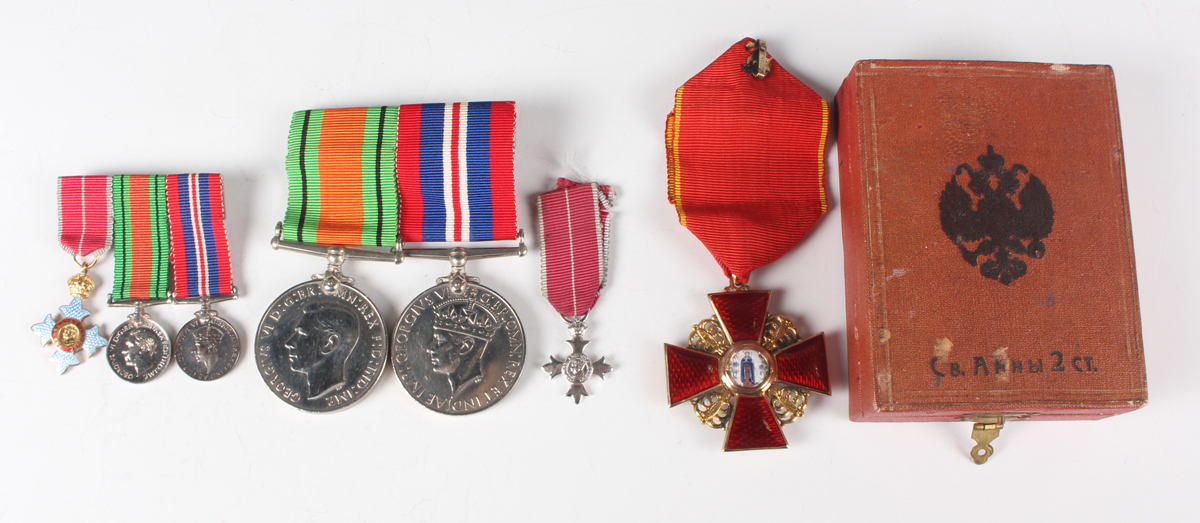 An Imperial Russian gold and enamelled Order of Saint Anne, 2nd class, civil division, circa 1900-1914, the suspension detailed ‘56’, with a ribbon and case, a 1939-45 Defence Medal and a War Medal, mounted on a bar, a group of three dress miniature medals, comprising CBE military division, Defence Medal and War Medal, mounted on a bar, and a dress miniature MBE military division.