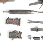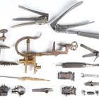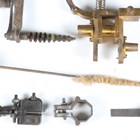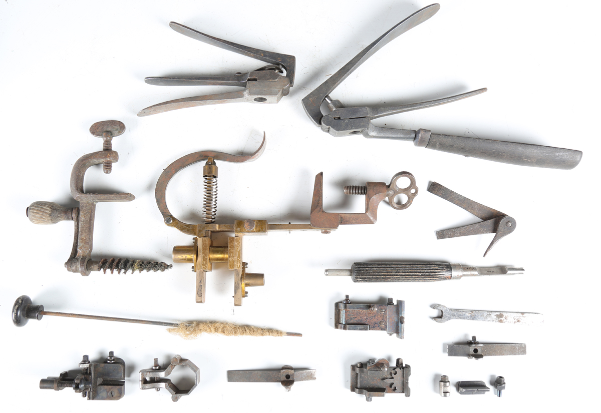 A small collection of late 19th and early 20th century gun loading tools and parts, including a scarce Stiegele bench-mounted lacquered brass and steel cartridge loading tool with spring-handle gravity feed mechanism, length 22.5cm.