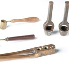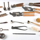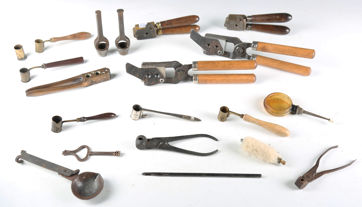 A collection of 19th century and later gun related accessories, including a brass pincer bullet mould by R. Adams, detailed 'Patented 28 Nov 1851', a steel pincer bullet mould, detailed '20' to the body, a wad-cutter, marked 'Priory 16', and a brass powder measure with fine turned rosewood handle.