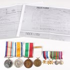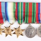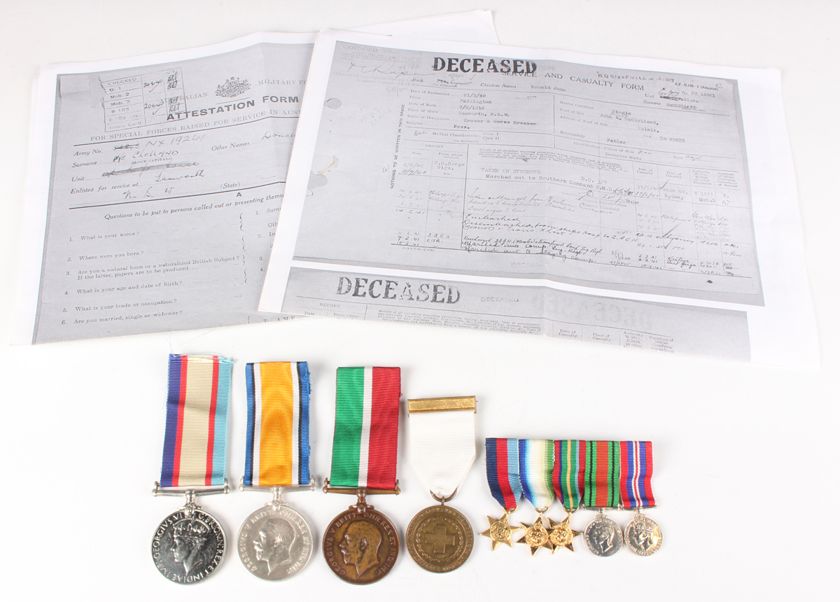 A 1914-18 British War Medal and a Mercantile Marine War Service Medal to ‘Herbert Farmer’, a British Red Cross Society War Services Medal, a 1939-45 Australia Service Medal to ‘NX19261 D.J.McClelland’, with associated facsimile paperwork, and a group of five Second World War miniature medals, mounted on a bar.
