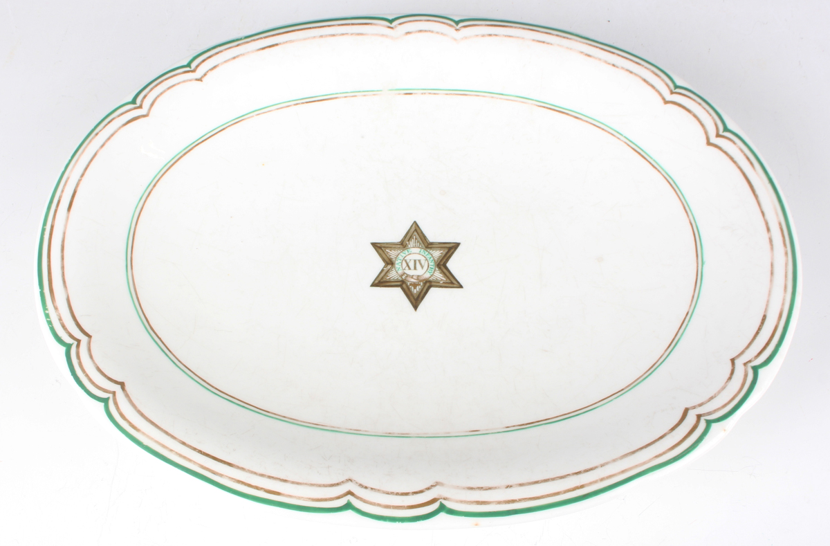 An oval porcelain footed dish of Indian Army and East India Company Forces interest, the centre with the badge of the Gwalior Star 1843, representing either Maharajpoor or Punniar and detailed ‘XIV Native Infantry’.