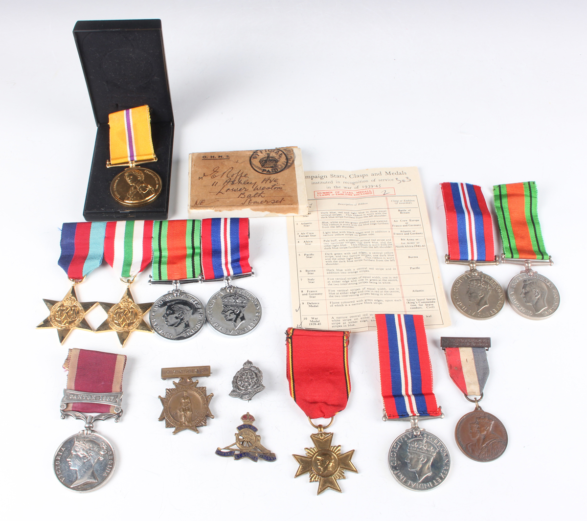 A Second China War Medal with bar ‘Canton 1857’ (the naming erased), seven late issue or copy Second World War medals, comprising four mounted on a bar, a Defence Medal and two War Medals, a 2002 Golden Jubilee Commemorative Medal to ‘14419255 L/Cpl. D.A.Inder. Queens Royal Regt’, and five further items.