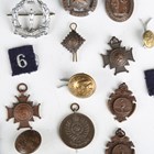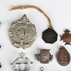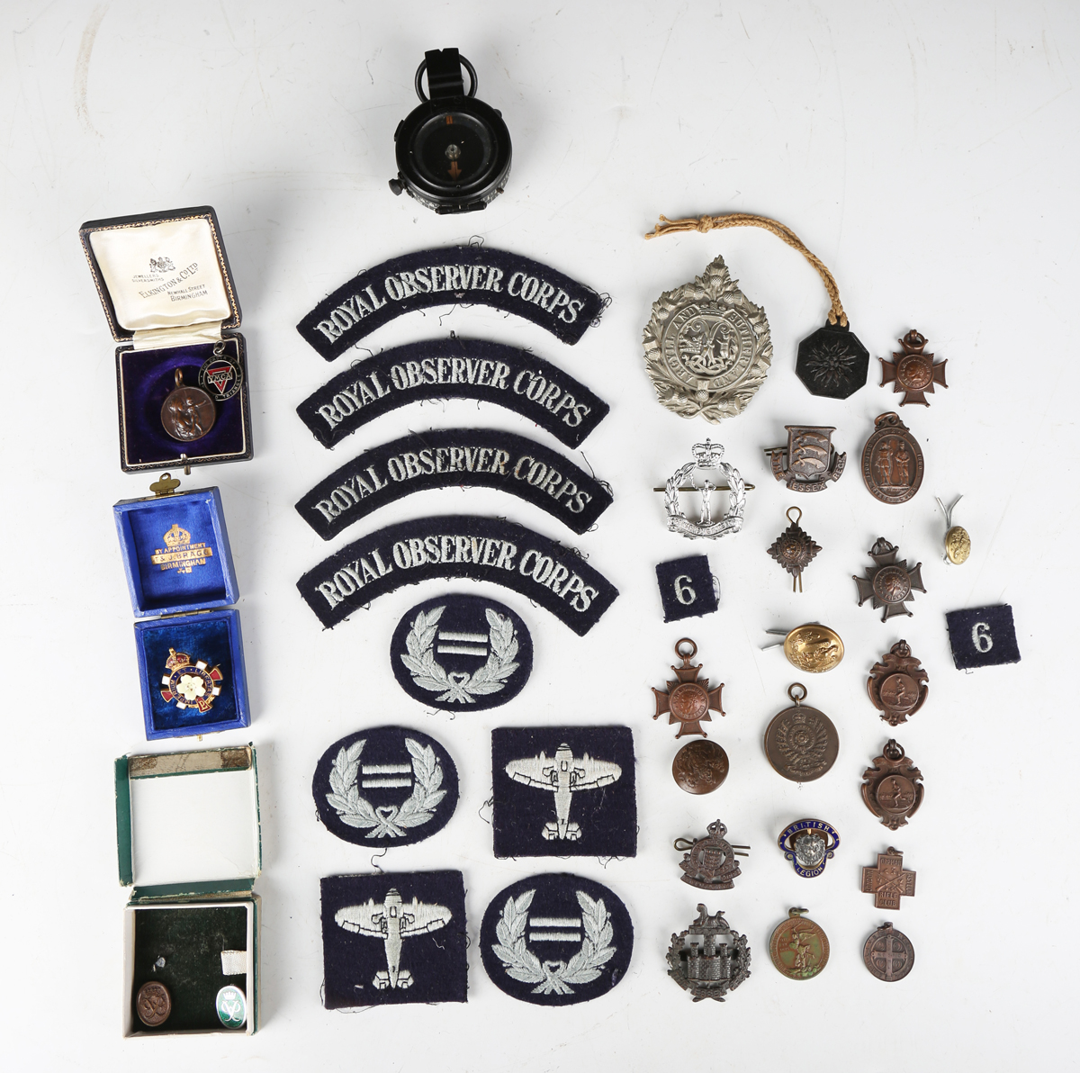 A small collection of military badges and other items, including a group of Royal Observer Corps cloth badges and a military pocket compass by J.M. Glauser, London, No. B.5373, Mk. IX, dated 1939.