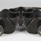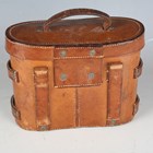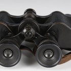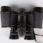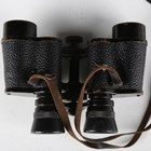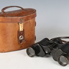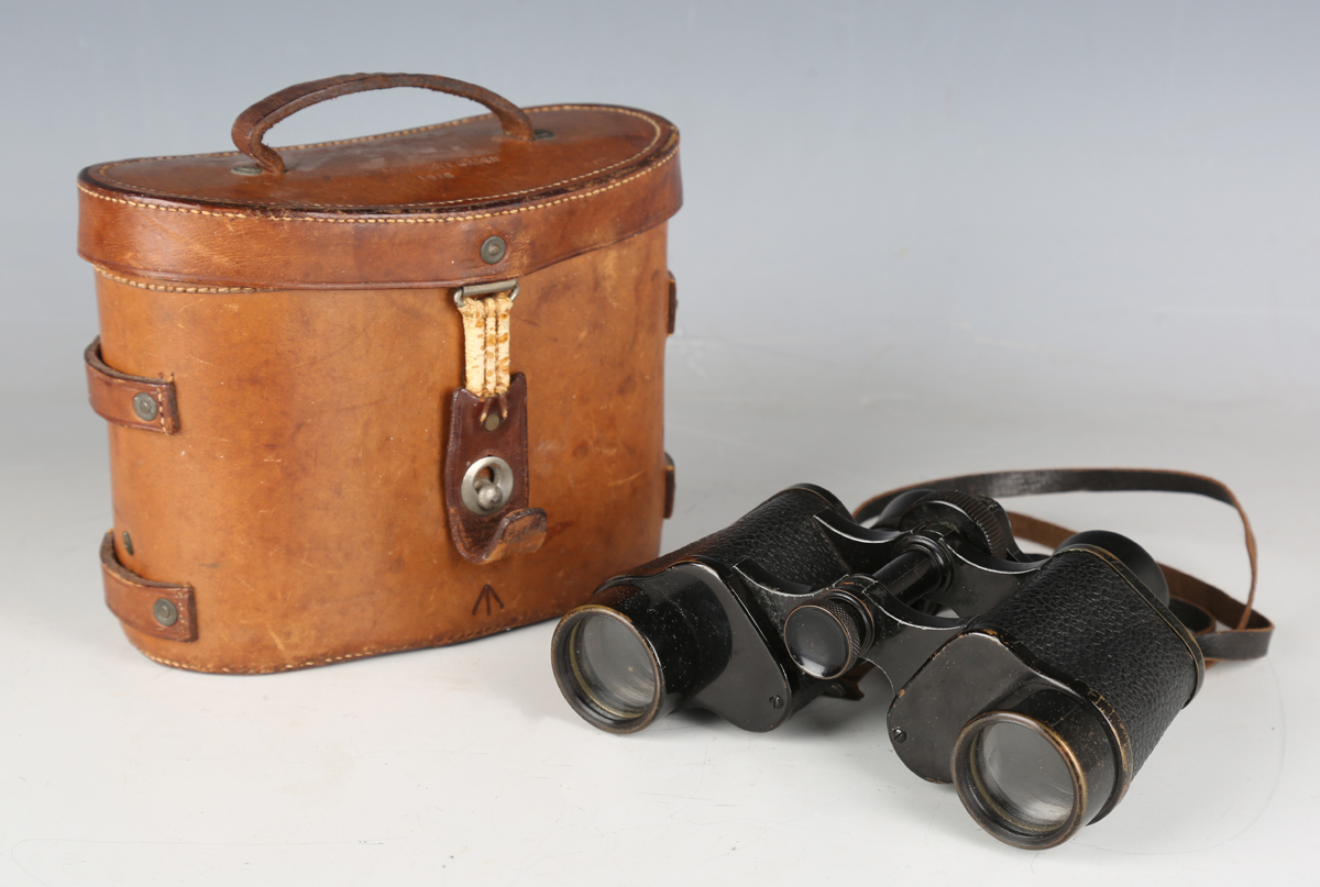 A pair of early 20th century 8x binoculars by Helles, Paris, with black finished body and leather neck strap, with an associated military issue stitched leather case by John & Bennett Green, dated 1916 and detailed 'Case No. 2, Mark I, Prismatic Binocular'.