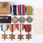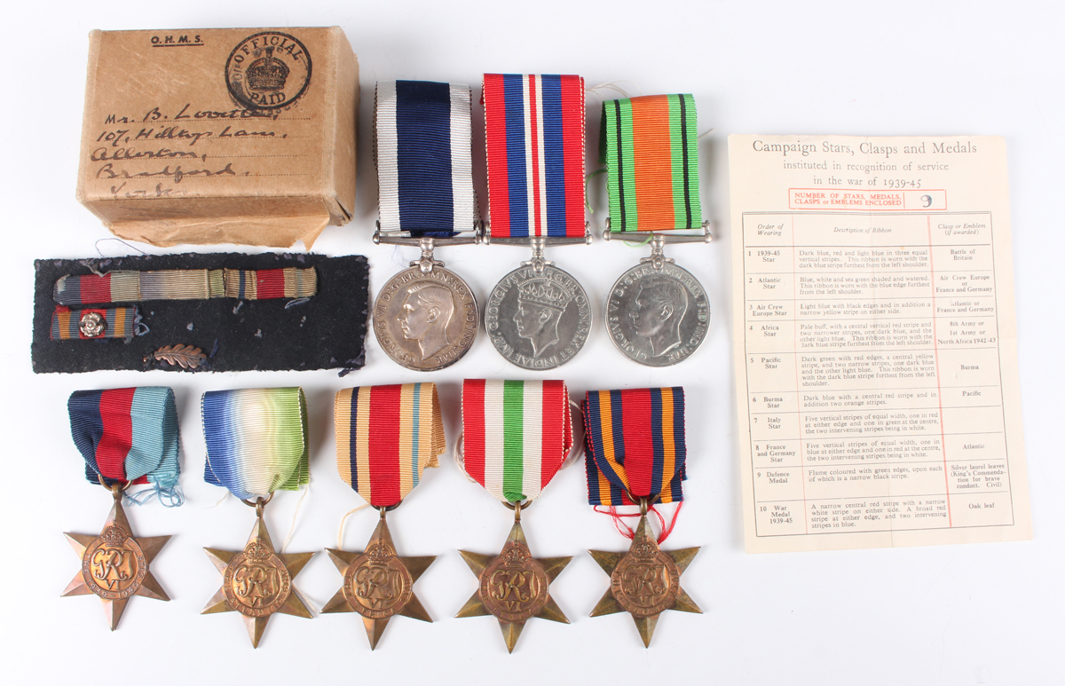 A group of eight Second World War and later medals, comprising 1939-45 Star, Atlantic Star, Africa Star, Italy Star, Burma Star, Defence Medal, War Medal and Navy Long Service and Good Conduct Medal, George VI issue, to ‘MX 48420 B.Lovette.P.O.Ck. H.MS.Dolphin.’, with ribbons indicating rosette on the Burma Star and an MiD spray (eight further ribbons lacking), with an admiralty forwarding slip confirming nine awards, a slip giving detail of bronze oak leaf emblem, a forwarding letter confirming the award of the Navy LSGC, dated 7th Jan 1946, further copied paperwork and a forwarding box of postage, addressed to ‘Mr B Lovette’.
