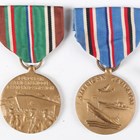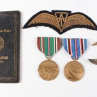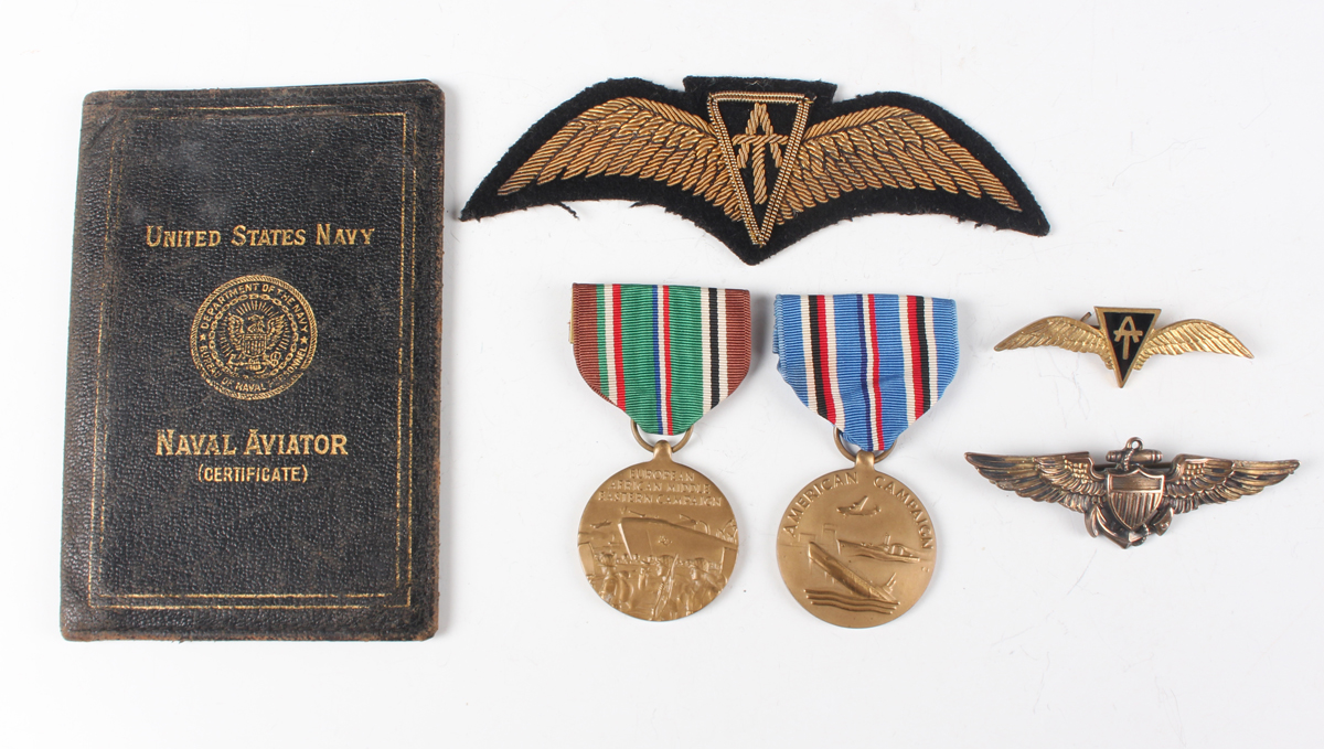 Two Second World War USA medals, comprising European-African-Middle Eastern Campaign Medal and American Campaign Medal, fitted with ribbon brooches, a United States Navy Flyers silver gilt wings brooch badge (replacement pin), two further badges, a birth identity card, detailed ‘Sgt Michie R.G., Born 31 October 1921’, and a Navy Flyers Creed Card, contained in a wallet, detailed ‘United States Navy Naval Aviator (Certificate)’.