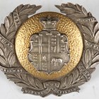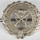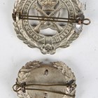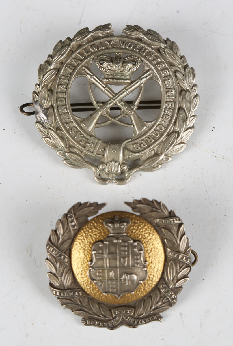 A scarce late Victorian/early Edwardian pressed white metal pagri badge for the East Indian Railway Volunteer Rifle Corps, detailed with crossed rifles below queen's crown within a wreath border, twin lugs to reverse (soldered conversion from pin and hinge fitting), together with a late Victorian East Indian Railway Volunteer Rifles helmet badge with gilt centre and applied metal crest over a pressed metal wreath body, twin lugs to reverse.