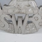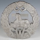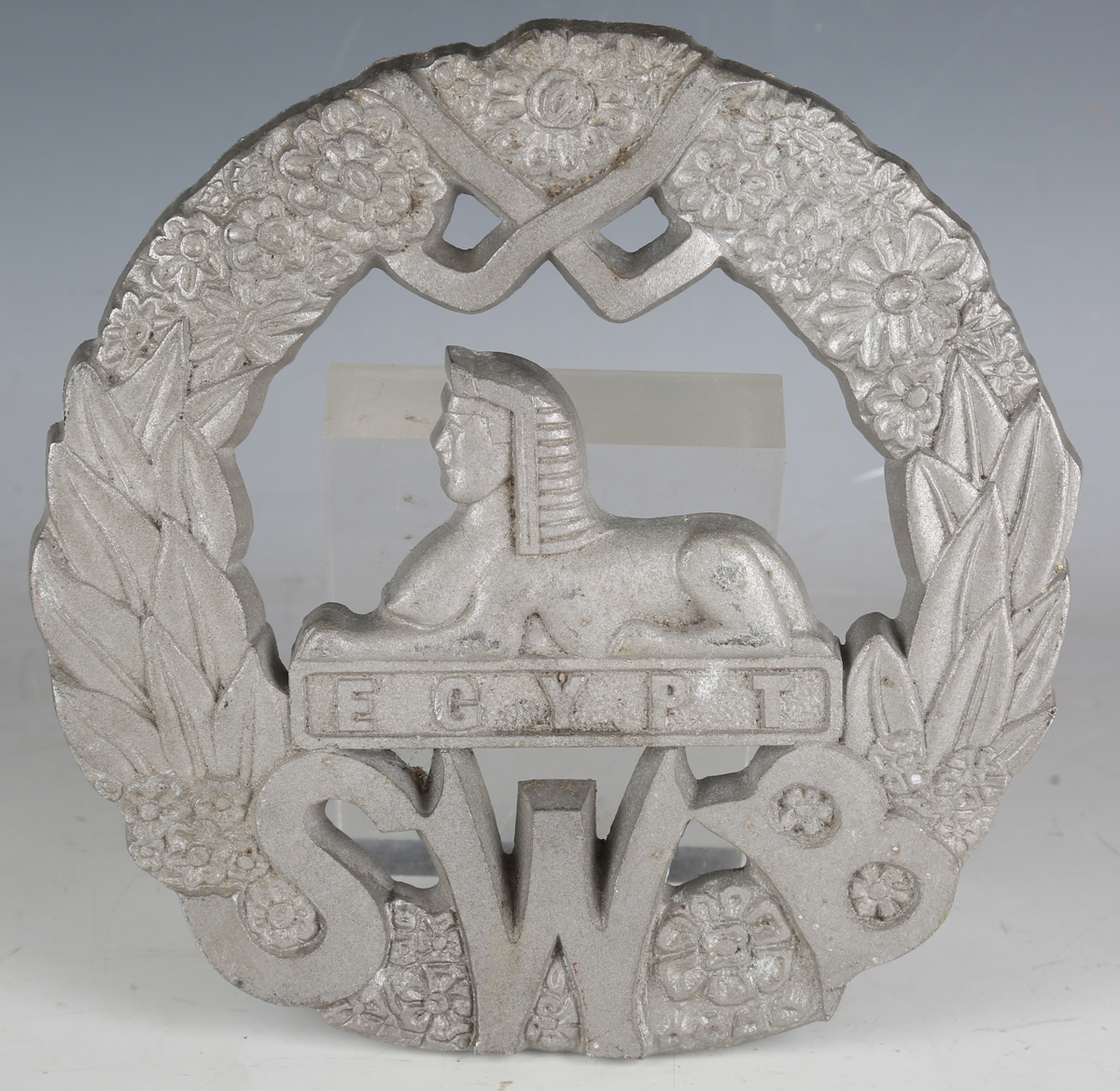A large early 20th century cast aluminium/white metal badge of the South Wales Borderers with central sphinx above 'Egypt' within a wreath of immortelles with 'SWB' at the base, height 22.5cm, probably from an institution or decommissioned barracks.