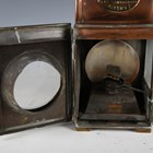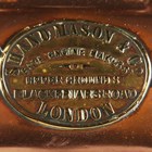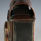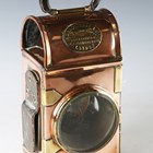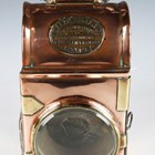 A late 19th/early 20th century copper and brass fire engine/carriage lamp by Shand Mason & Co, with stitched leather-covered carry handle, applied pressed brass maker's plate, detailed 'Shand Mason & Co, Fire Engine Makers, Upper Ground St, Blackfriars Road, London', circular glass light aperture, oblong bevelled glass side panel, adjustable wick burner and side-fitted clip suspension, height 25.5cm.