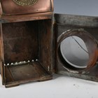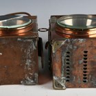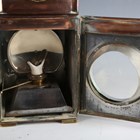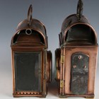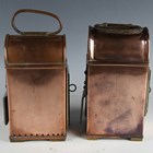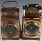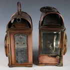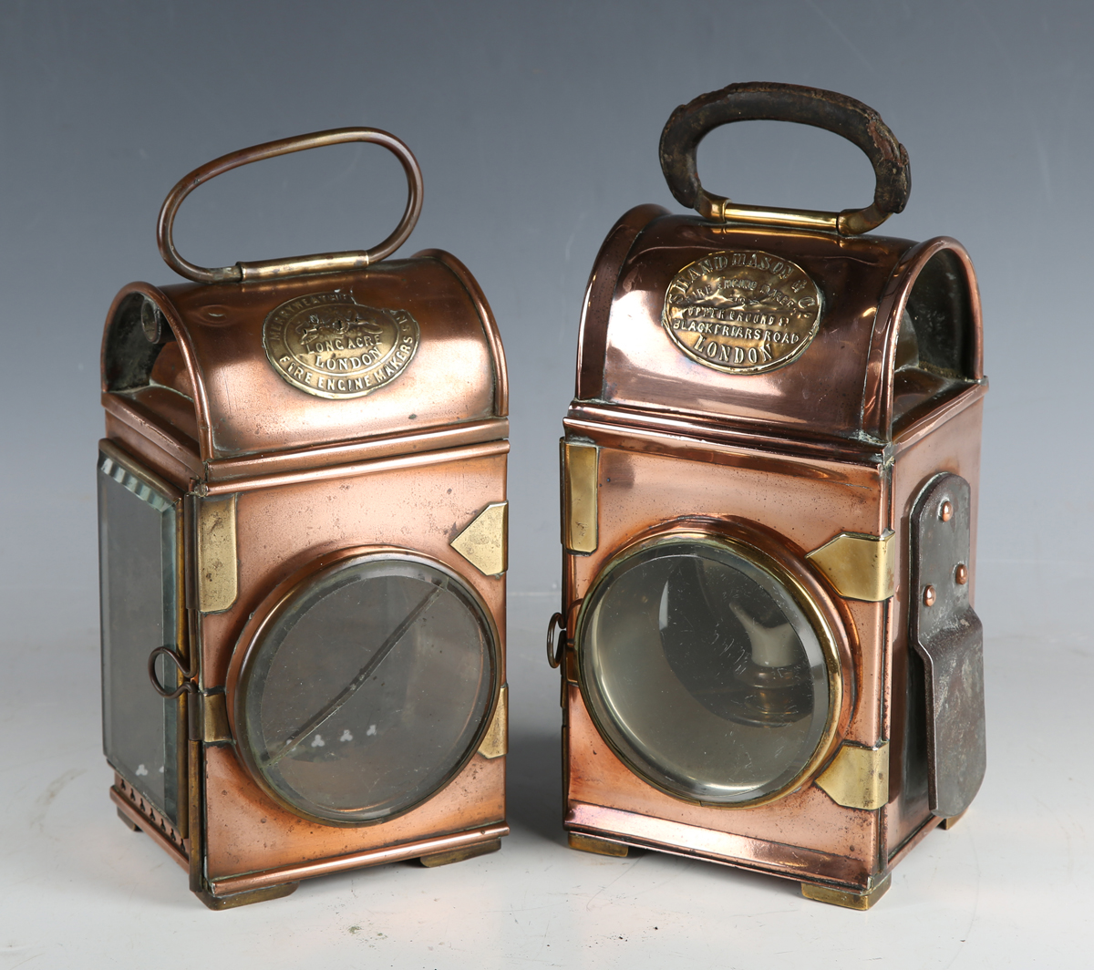 Two similar late 19th/early 20th century copper and brass fire engine/carriage lamps by Shand Mason & Co and Merryweather & Sons, each with applied pressed brass maker's plate, circular light aperture and clip suspension, heights 26cm and 23cm (both with faults).