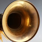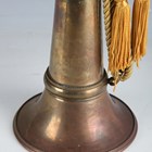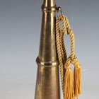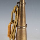 A 20th century brass speaking trumpet with typical shaped tapered body, collars with beaded decoration and shaped mouthpiece, the interior of the bell stamped 'TC 1990', with cord tassel suspension.