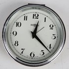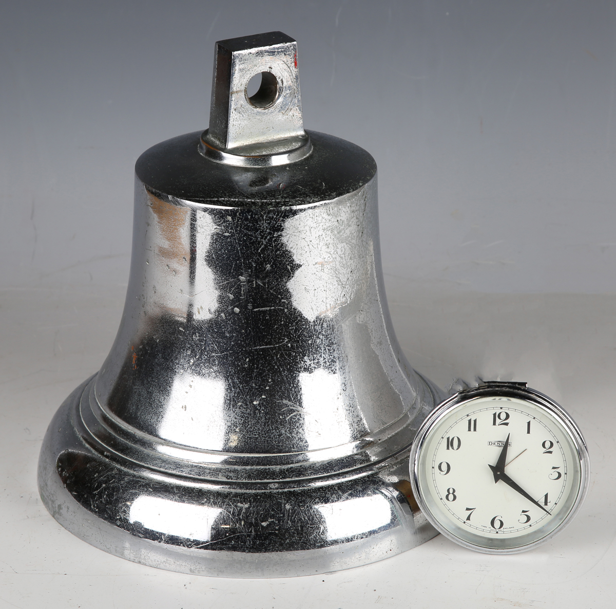 An early 20th century chrome finished fire engine bell, height 26cm, diameter 24cm, together with a Dennis fire engine clock with hinged chrome finished surround, diameter 9cm.