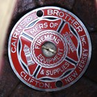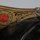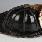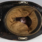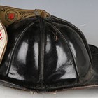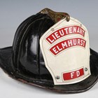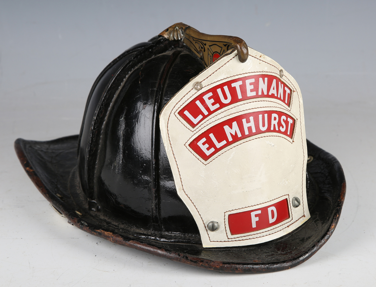 An American firefighter's helmet by Cairns & Brother Inc, Clifton, New Jersey, the stitched hard black leather body with applied shaped brass crest and white and red leather badge, detailed 'Lieutenant, Elmhurst FD', the interior with fitted fabric lining and applied maker's badge.