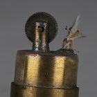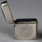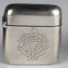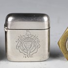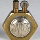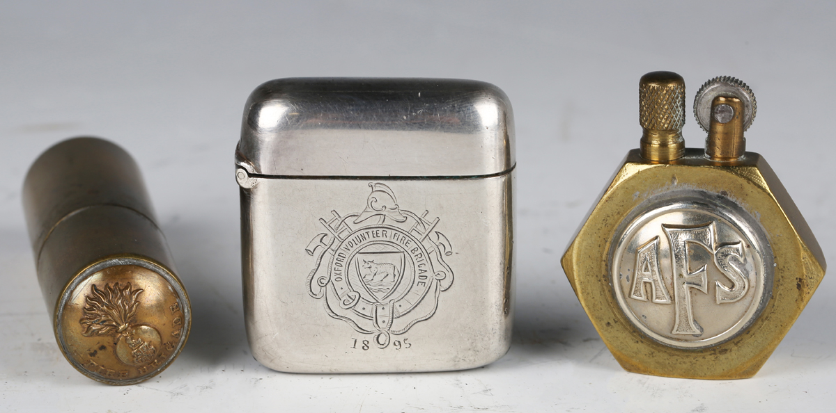 A scarce late Victorian silver match vesta, engraved to one side with the crest of the Oxford Volunteer Fire Brigade and dated 1895, and monogram engraved to the other, Birmingham 1894 by D&F, together with two brass cased trench art style lighters, one of hexagonal form, detailed to each side with a button of the Auxiliary Fire Service, the other of cylindrical form, each end with a flaming grenade Fire Brigade button.