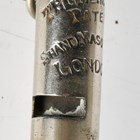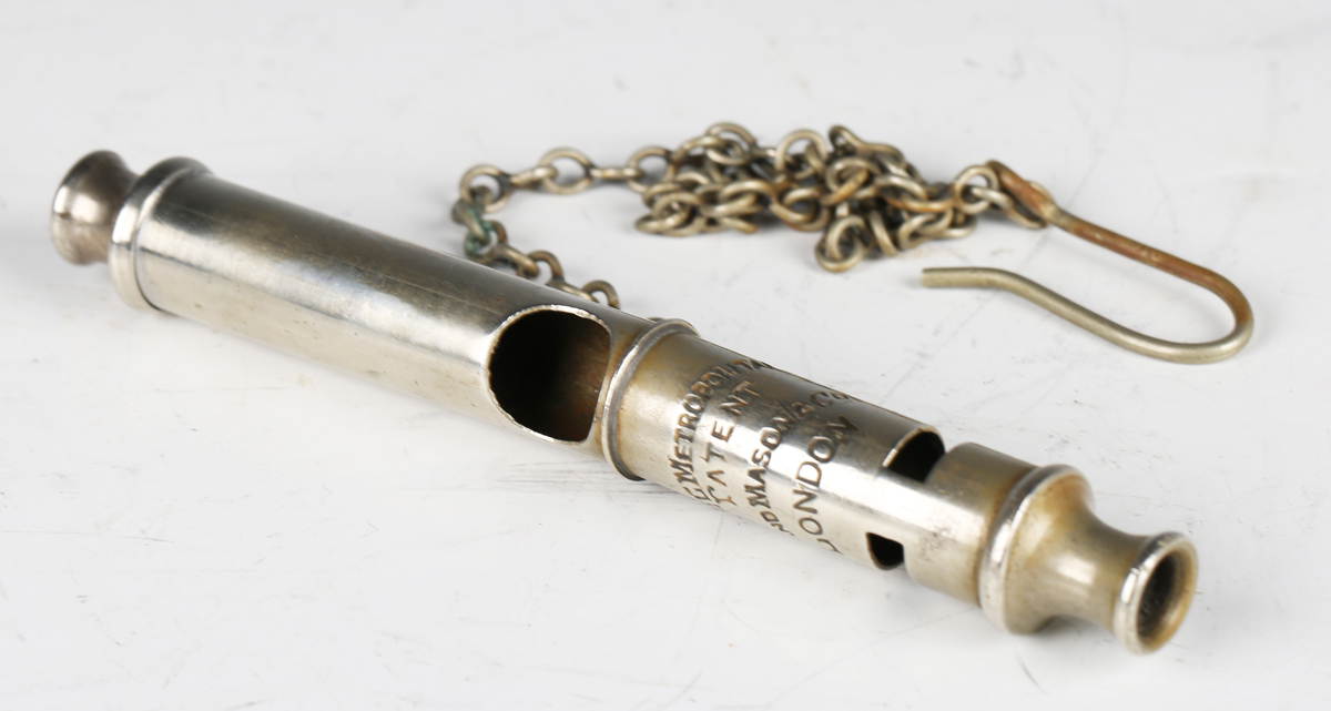 A rare late 19th/early 20th century firefighter officer's Metropolitan Patent double-ended nickel whistle by Shand Mason & Co, London, with suspension chain.