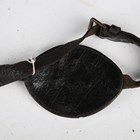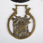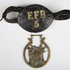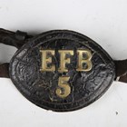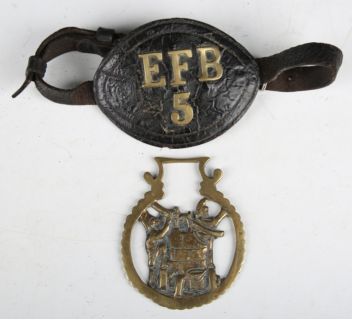 A scarce late 19th century fireman's armband with stitched leather body and buckle strap fitting with applied brass letters 'E F B 5', together with an early 20th century fire brigade related commemorative horse brass.