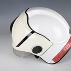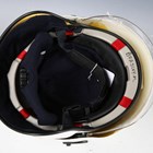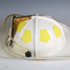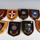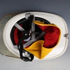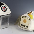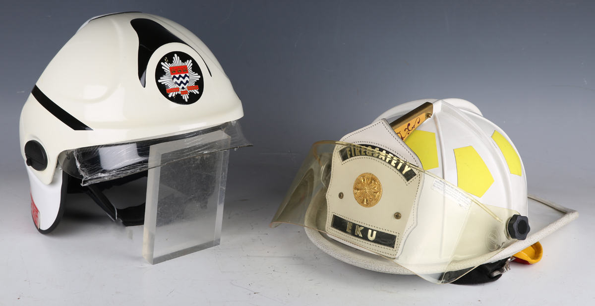 A group of late 20th century fire service related items, including a Cromwell F600 firefighter's helmet with applied 'London Fire Brigade' sticker badge, drop-down visor and adjustable fabric inner lining, ink-written to interior 'Beasley.M.', a Bullard firefighter's helmet with applied stitched leather badge, detailed 'Fire & Safety EKU', drop-down visor and adjustable fabric inner lining, and a group of fire brigade shields, including 'London Fire Brigade' and 'Fire Service College'.