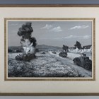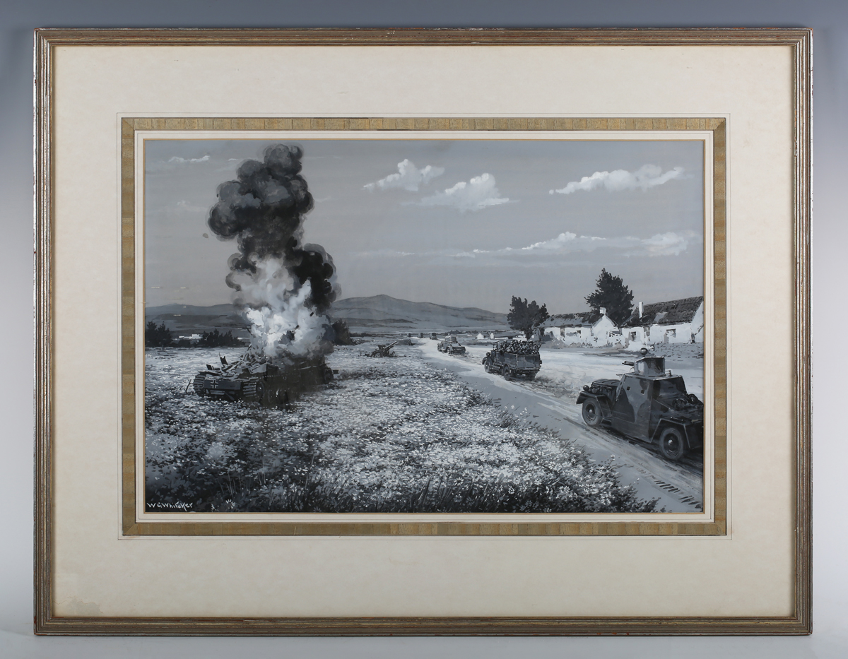 W.G. Whitaker (20th century) - Second World War convoy on a country road with a burning German tank, monochrome gouache, signed lower left, 32.5cm x 54.5cm, within a silvered frame.