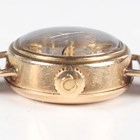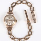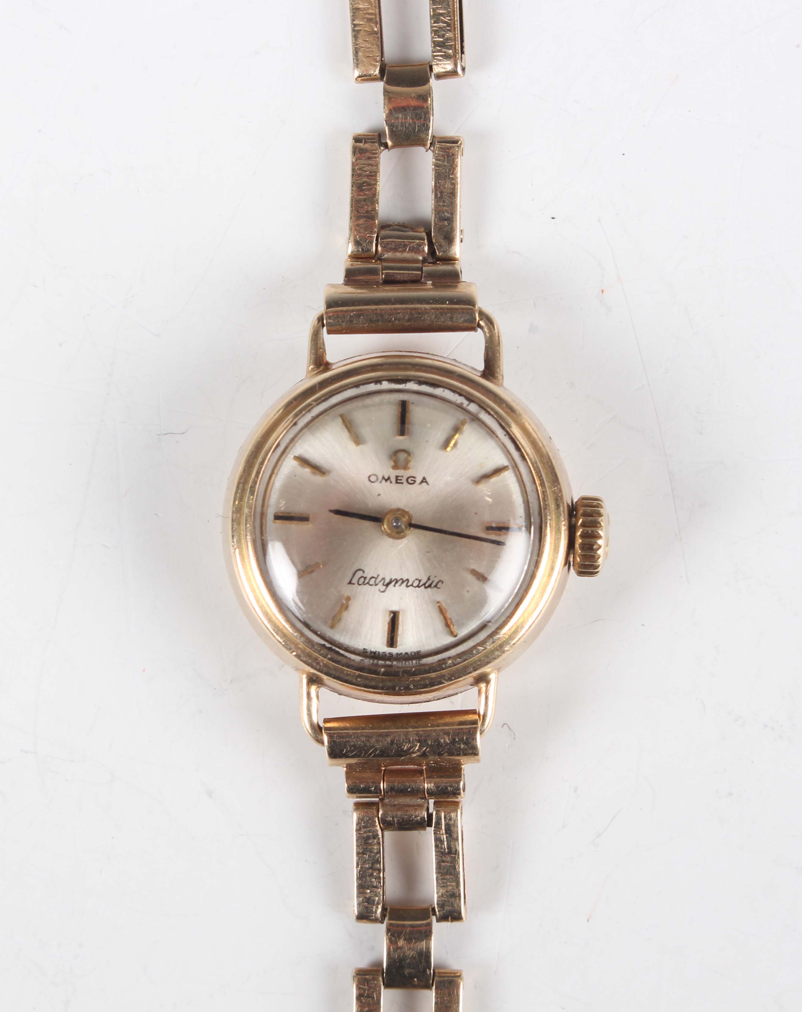 An Omega Ladymatic 9ct gold circular cased lady's wristwatch with signed and jewelled 661 caliber automatic movement, the signed silvered dial with gilt baton hour markers, London 1966, case diameter 1.7cm, on a 9ct gold textured link bracelet with foldover clasp, London 1985, total weight 14g, total length 17.5cm.