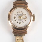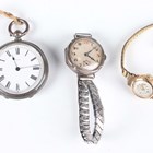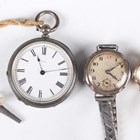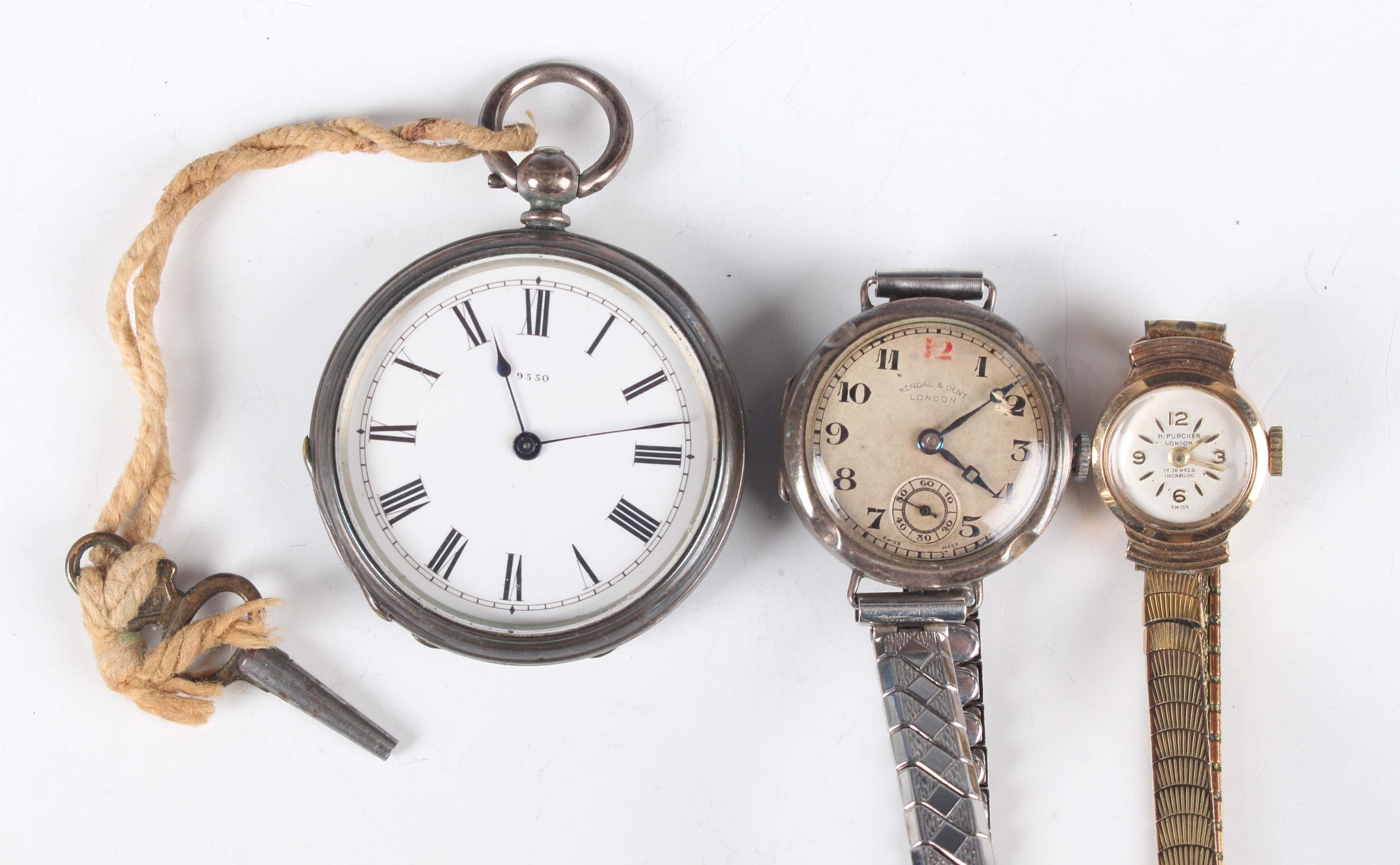 A silver cased keywind open-faced pocket watch, the white enamelled dial with black Roman hour numerals, case diameter 3.8cm, together with a 9ct gold cased lady's wristwatch, Edinburgh 1962, on a gilt metal bracelet, and a silver circular cased wristwatch, case diameter 2.6cm.