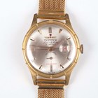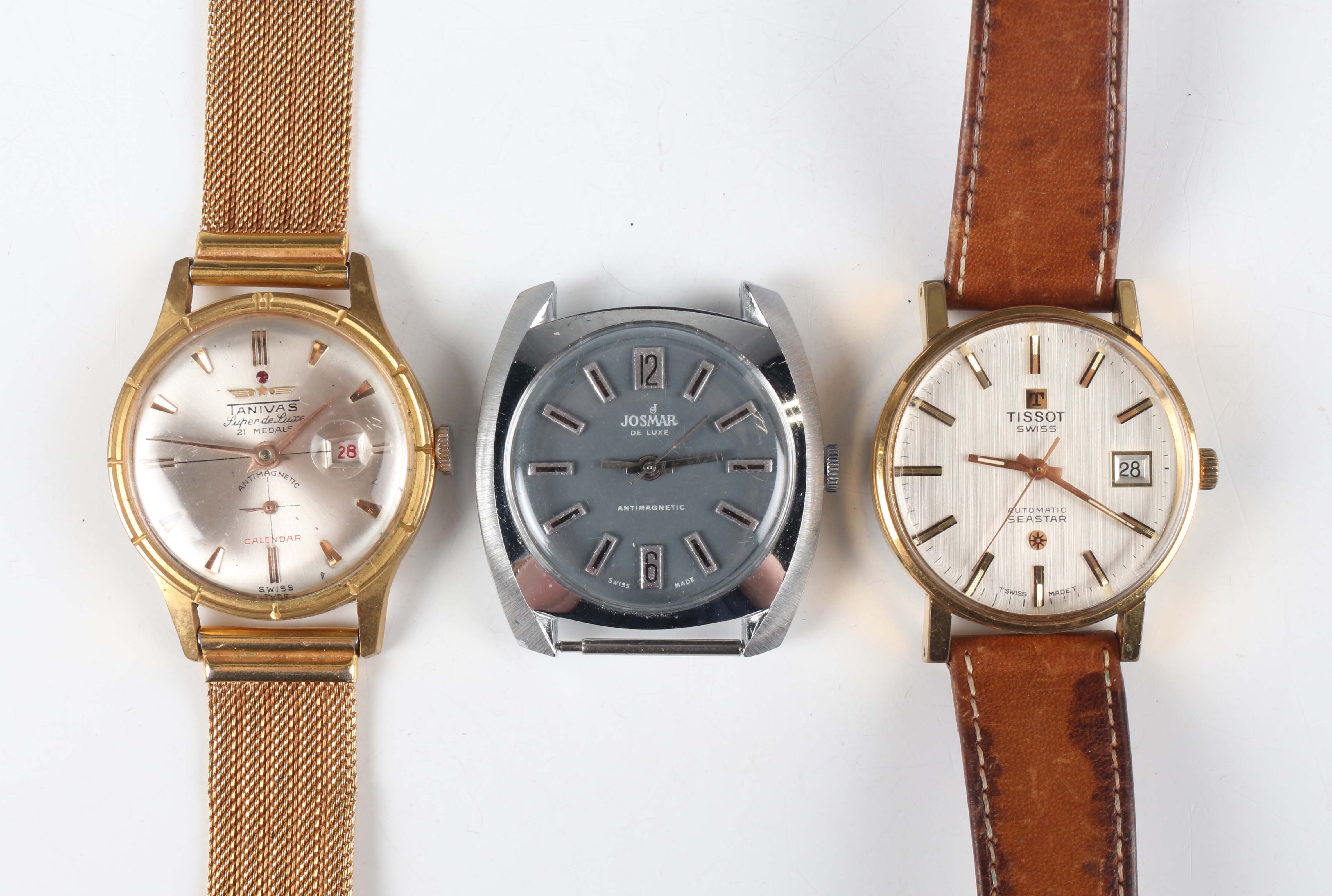 A Tissot Automatic Seastar gilt metal fronted and steel backed circular cased gentleman's wristwatch, the signed silvered dial with date aperture, case diameter 3.4cm, on a brown leather strap, together with a Tanivas Super De Luxe Calendar gilt metal cased gentleman's wristwatch, case diameter 3.4cm, and a Josmar De Luxe gentleman's wristwatch, case width 3.6cm.