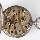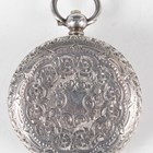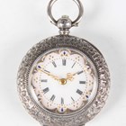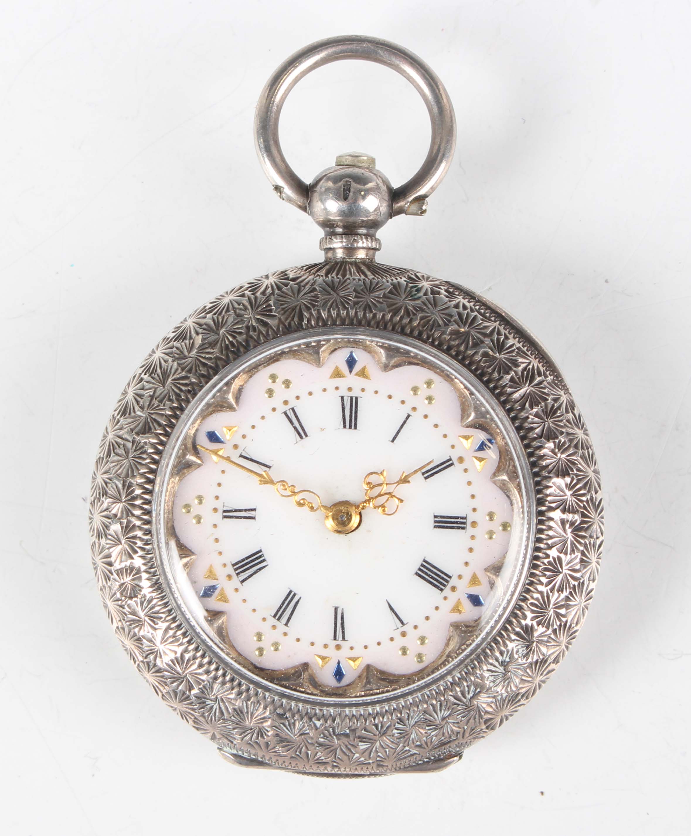A late 19th century Swiss silver cased keywind open-faced lady's fob watch, the white enamelled dial with black Roman hour numerals, the case with foliate engraved decoration, the case interior detailed '0.935', case diameter 3.5cm.