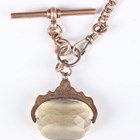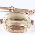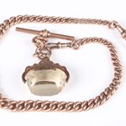 A 9ct gold graduated curblink Albert watch chain, fitted with two swivels and a T-bar, weight 42.7g, length 33cm, also hung with a 9ct gold mounted facet cut citrine revolving fob, Birmingham 1901, width 2.9cm.
