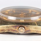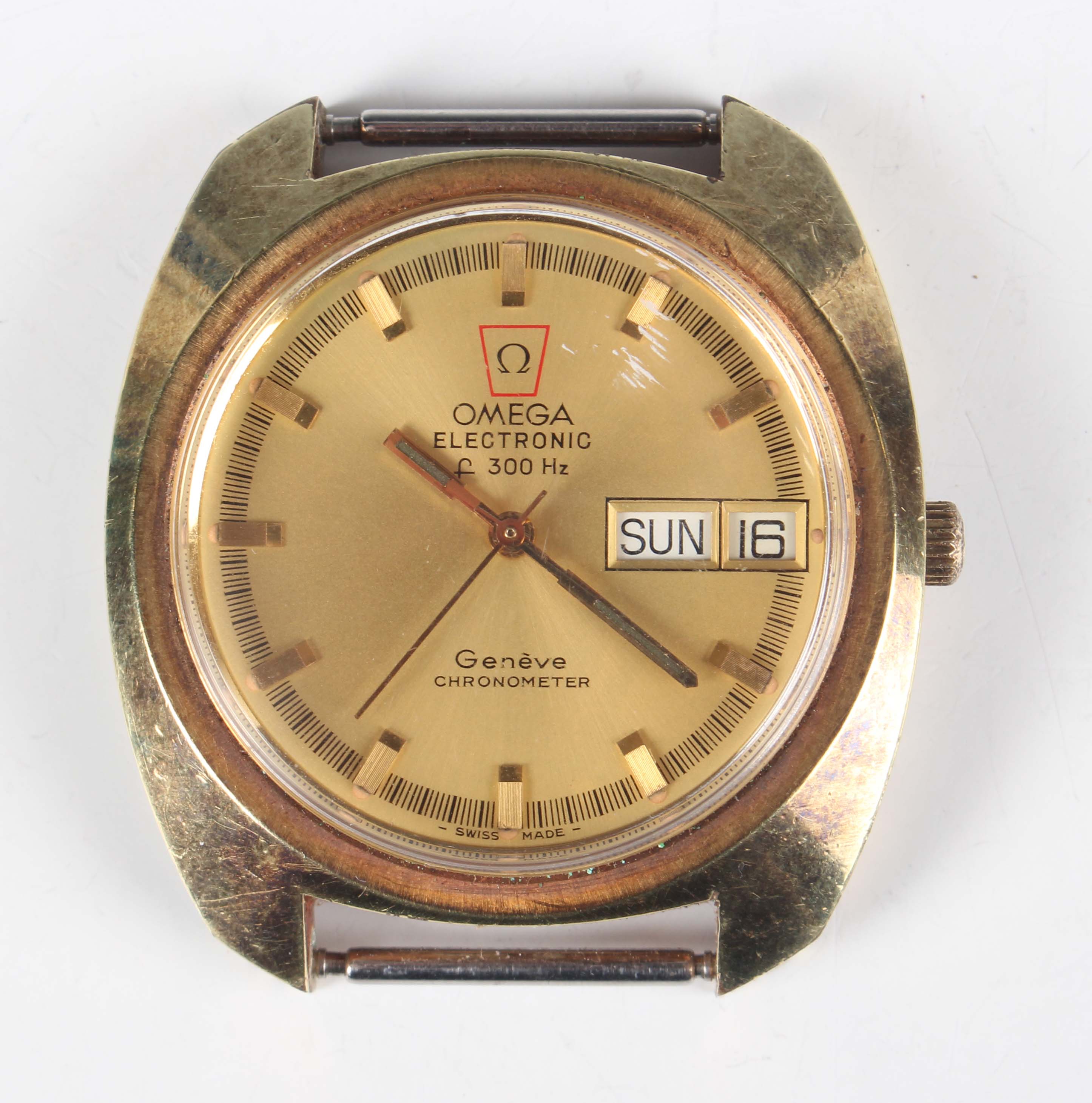 An Omega Electronic F300 Hz Chronometer gilt metal fronted and steel backed gentleman's wristwatch, the signed gilt dial with baton hour markers and day and date apertures, case width 3.8cm.