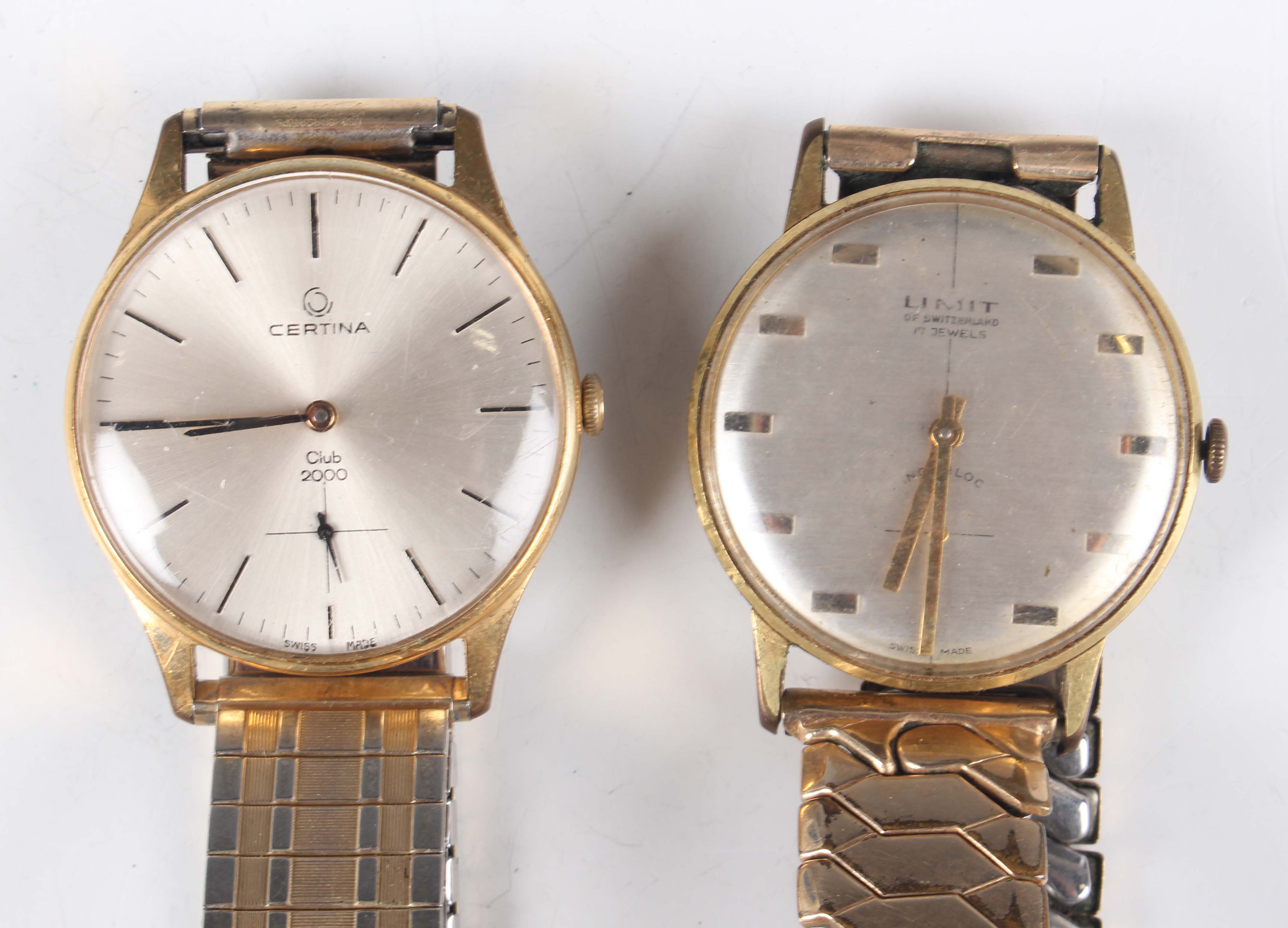 A Certina Club 2000 gilt metal fronted and steel backed gentleman's wristwatch with manual wind movement, case diameter 3.4cm, together with a Limit of Switzerland gilt metal fronted and steel backed gentleman's wristwatch with manual wind movement, case diameter 3.4cm, each on a gilt metal fronted expanding bracelet.