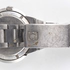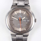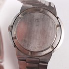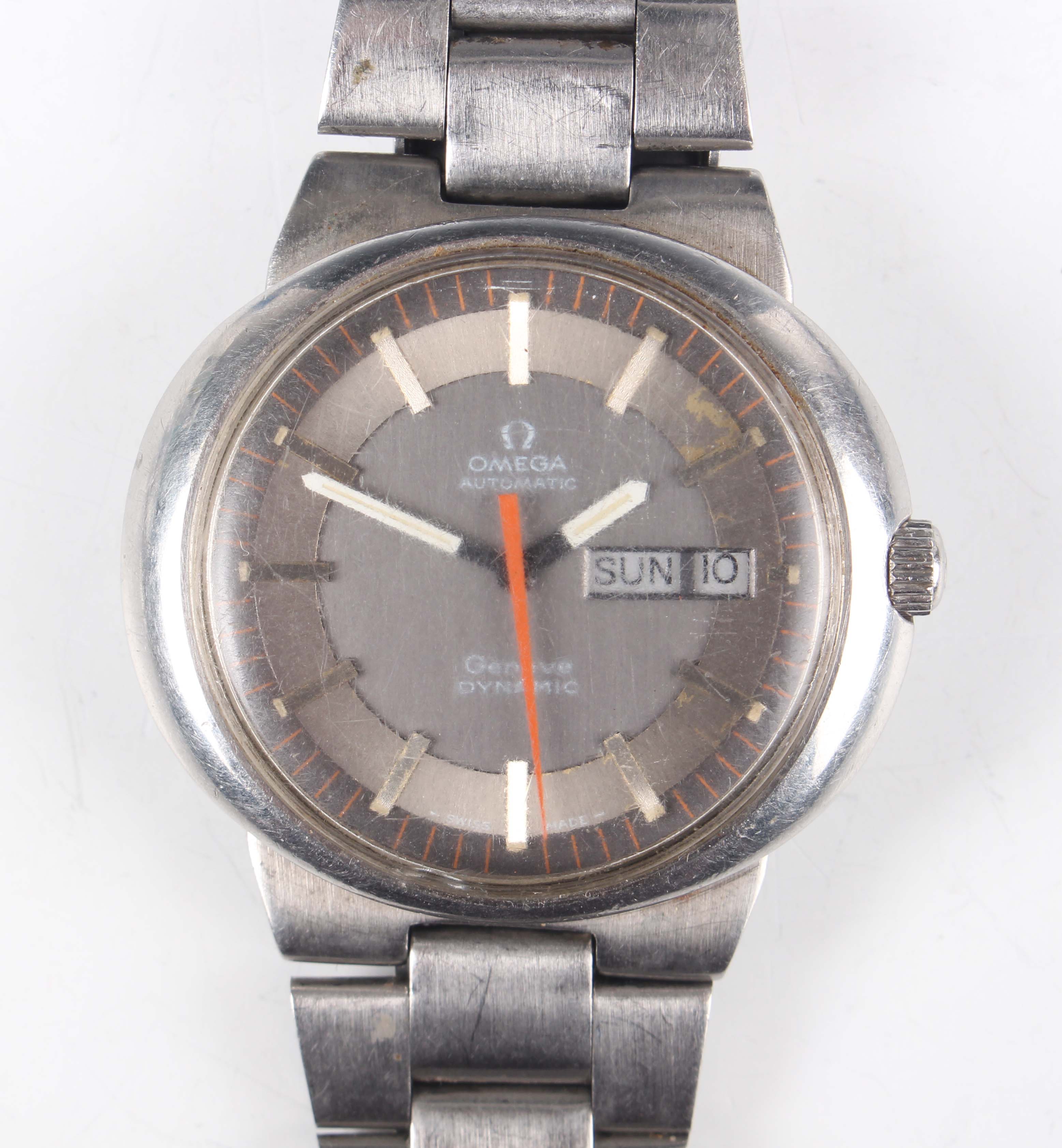 An Omega Automatic Genève Dynamic stainless steel gentleman's bracelet wristwatch, the signed brown dial with centre seconds and day and date apertures, the silvered chapter ring with baton hour markers, the tapered link bracelet with signed foldover clasp, case width 4cm.