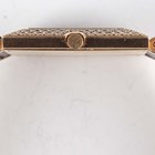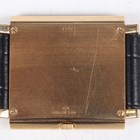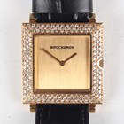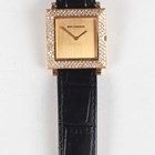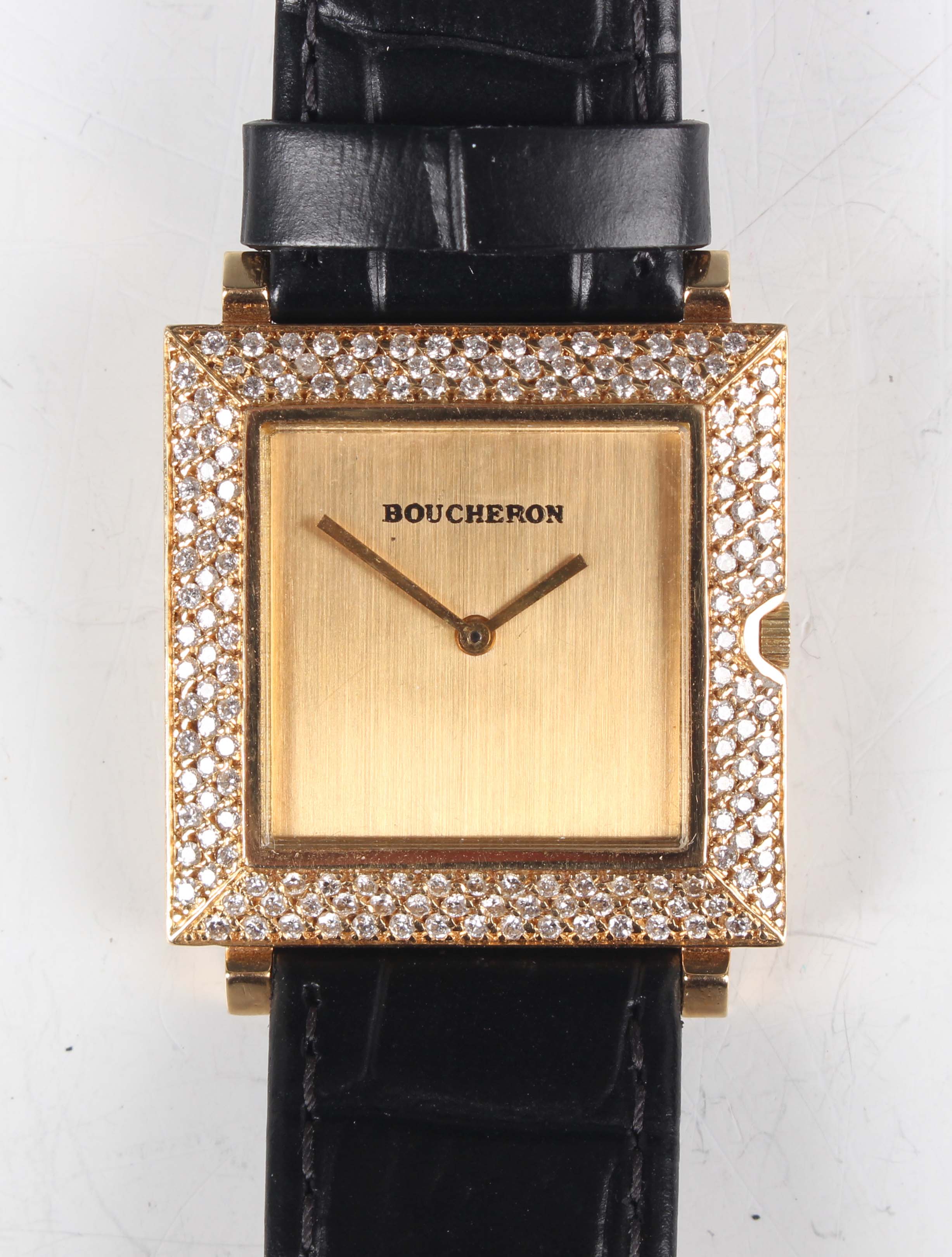 A Boucheron 18K gold and diamond set square cased gentleman's wristwatch with ETA quartz movement, the signed gilt dial with gilt hands, the case set with a surround of circular cut diamonds, the case back interior detailed '18K 0.750' and numbered '27104', the signed case back numbered '75821', case width 2.6cm, on a black leather strap with gilt metal buckle.