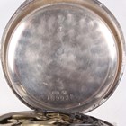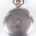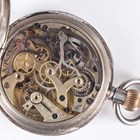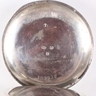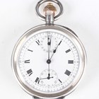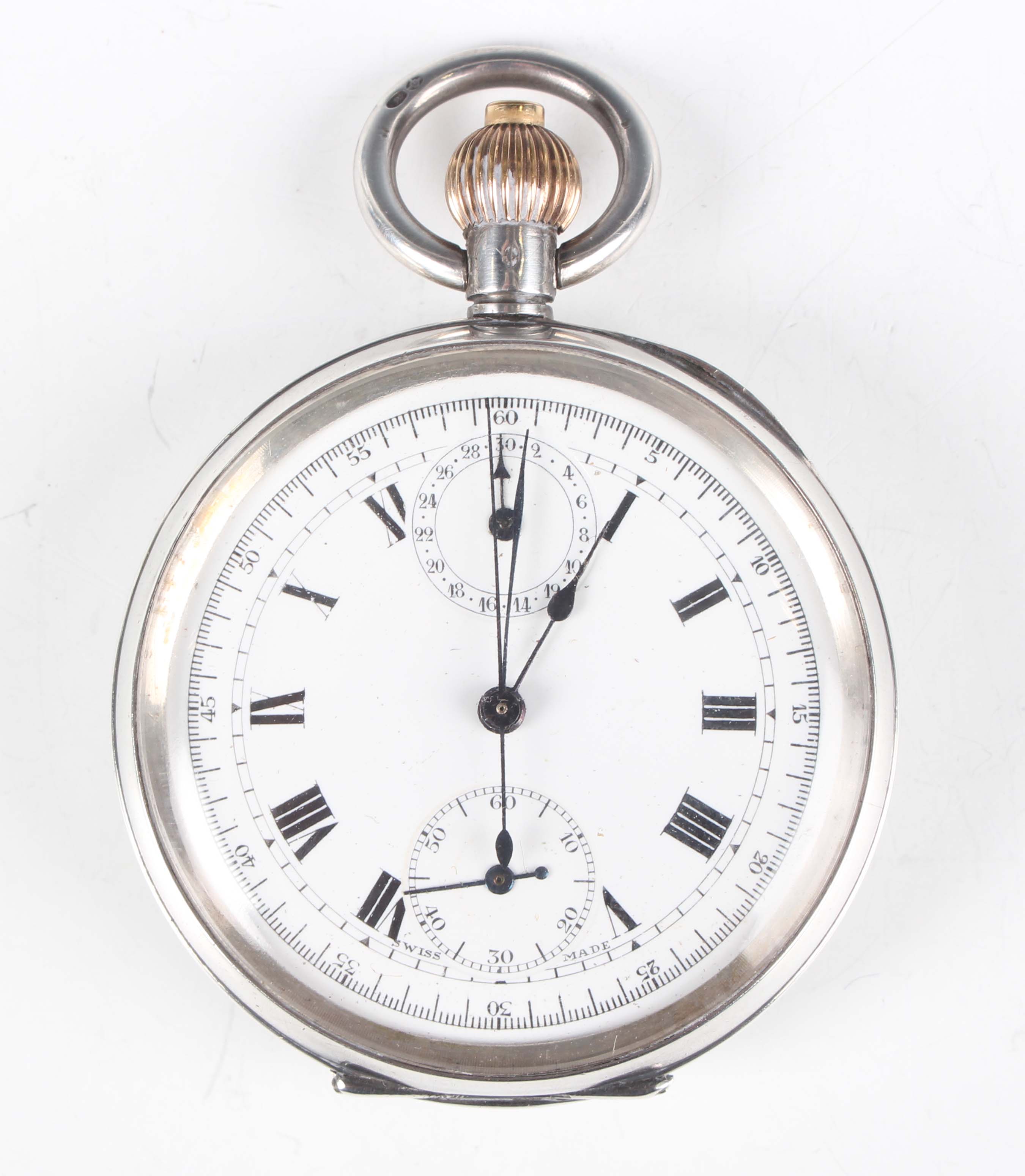 An early 20th century silver cased keyless wind open-faced gentleman's chronograph pocket watch, the unsigned jewelled movement numbered '1208402', the white enamelled dial with black Roman hour numerals, two subsidiary dials and centre stop seconds, with silver inner case, the case back with engine turned decoration, London 1920, total weight 84.3g, case diameter 4.8cm.