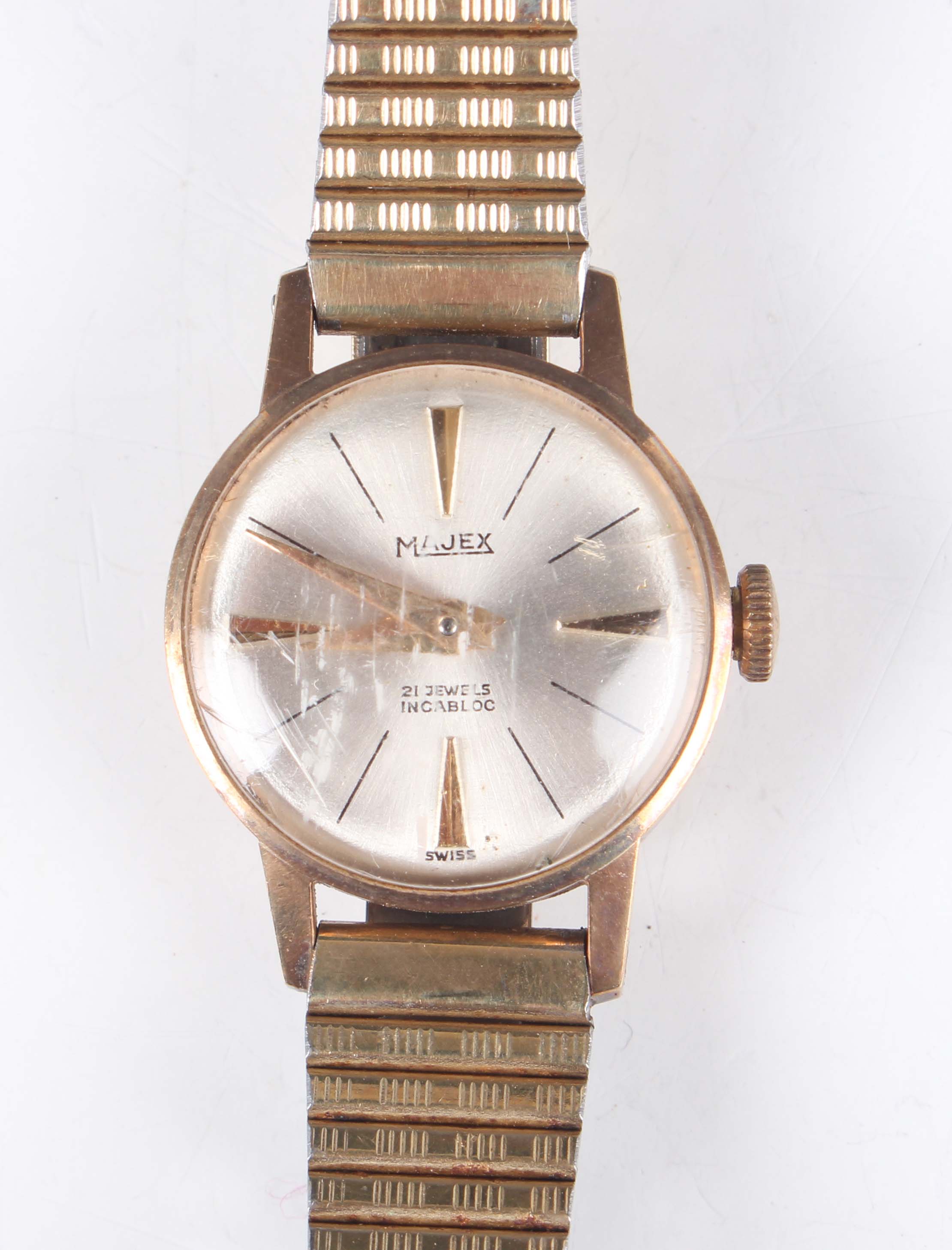 A Majex 9ct gold circular cased lady's wristwatch, the jewelled lever movement detailed 'Swiss', with signed silvered dial, Edinburgh 1967, case diameter 1.9cm, on a base metal bracelet.