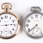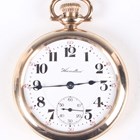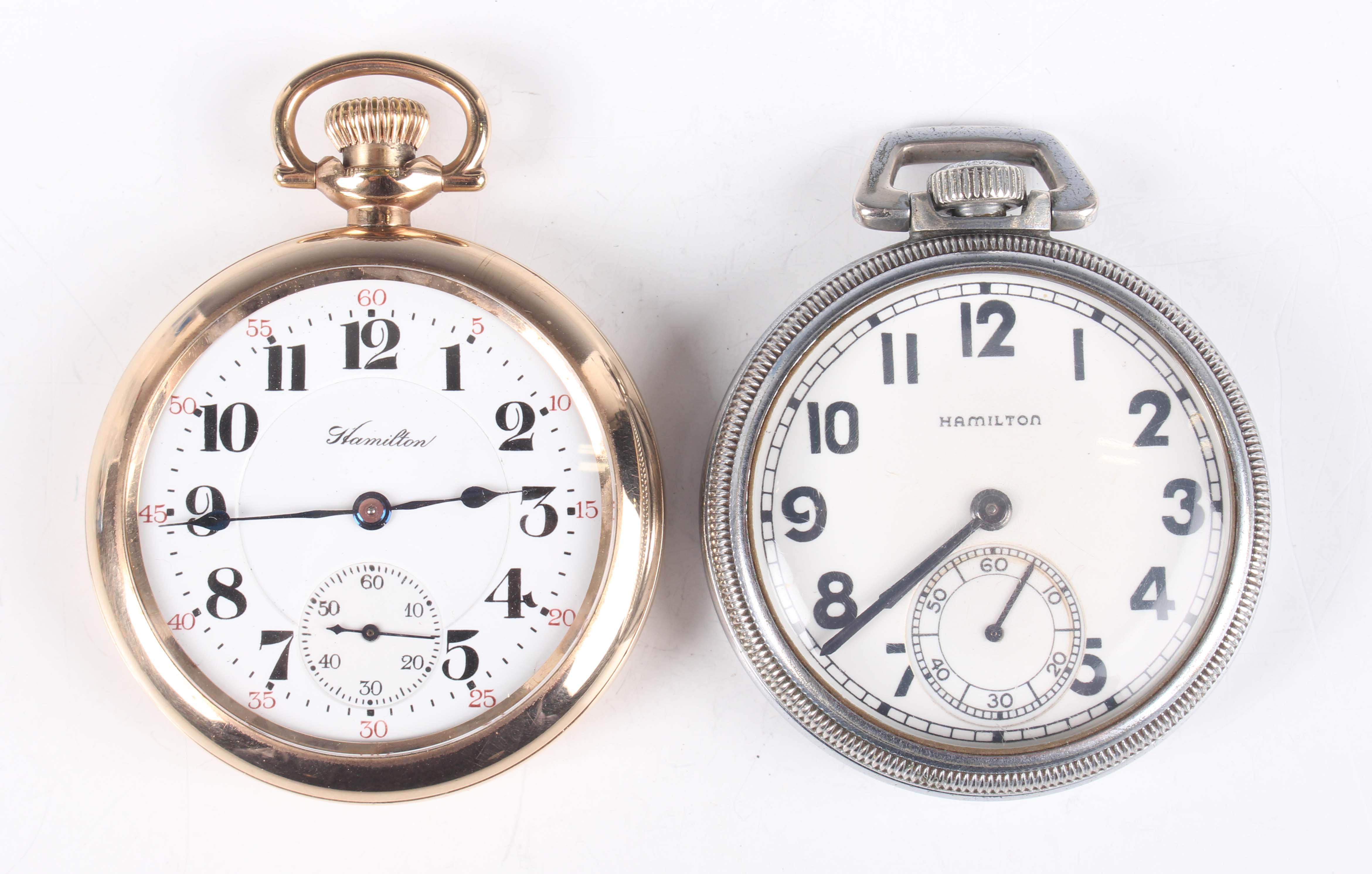 An early 20th century Hamilton gilt metal keyless wind open-faced gentleman's pocket watch, the signed and jewelled 972 caliber movement numbered '1557619', the signed white enamelled dial with black Arabic hour numerals, outer red Arabic minutes and subsidiary seconds, case diameter 5.2cm, together with a Hamilton base metal cased US Navy Bureau of Ships Comparing Watch, the signed case back detailed '3543-1942', case diameter 5cm.