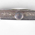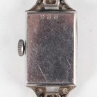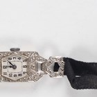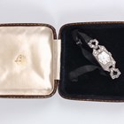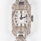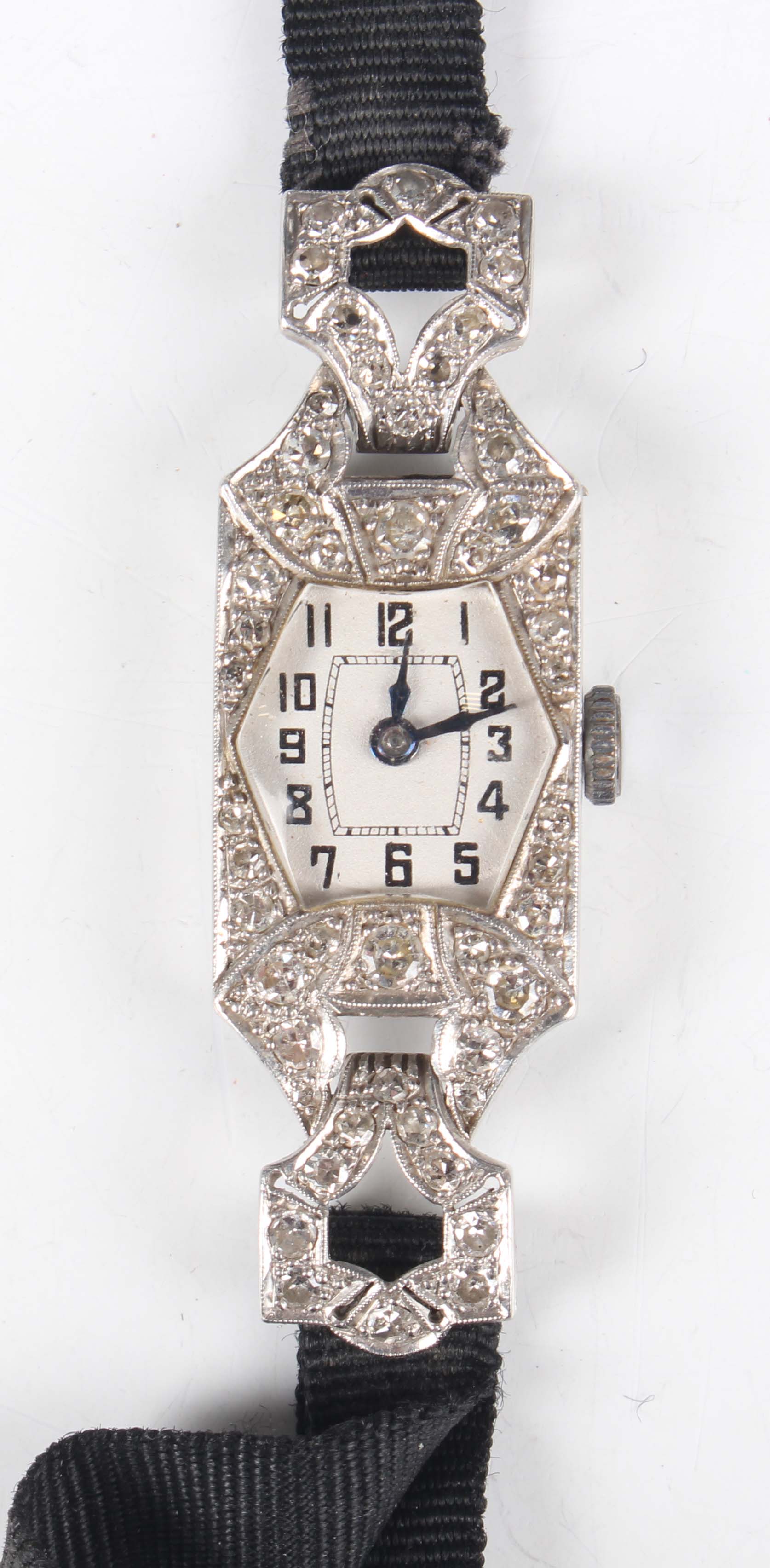 A platinum and diamond set rectangular cased lady's dress wristwatch with unsigned jewelled movement, the unsigned silvered dial with black Arabic hour numerals, the shaped rectangular case and strap mountings set with single cut diamonds, the case back interior detailed 'All Platinum W Bros', the case back numbered '886', on a black silk strap, total weight 13.3g, with a brown leather case.