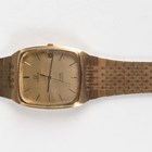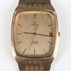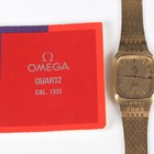 An Omega De Ville Quartz gilt metal fronted and steel backed gentleman's bracelet wristwatch, Ref. 192 0043, circa 1978, with signed 1332 caliber movement, the signed gilt dial with baton hour markers, centre seconds and date aperture, the gilt metal fronted bracelet with signed foldover clasp, case width 3.1cm, with instruction booklet.