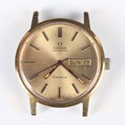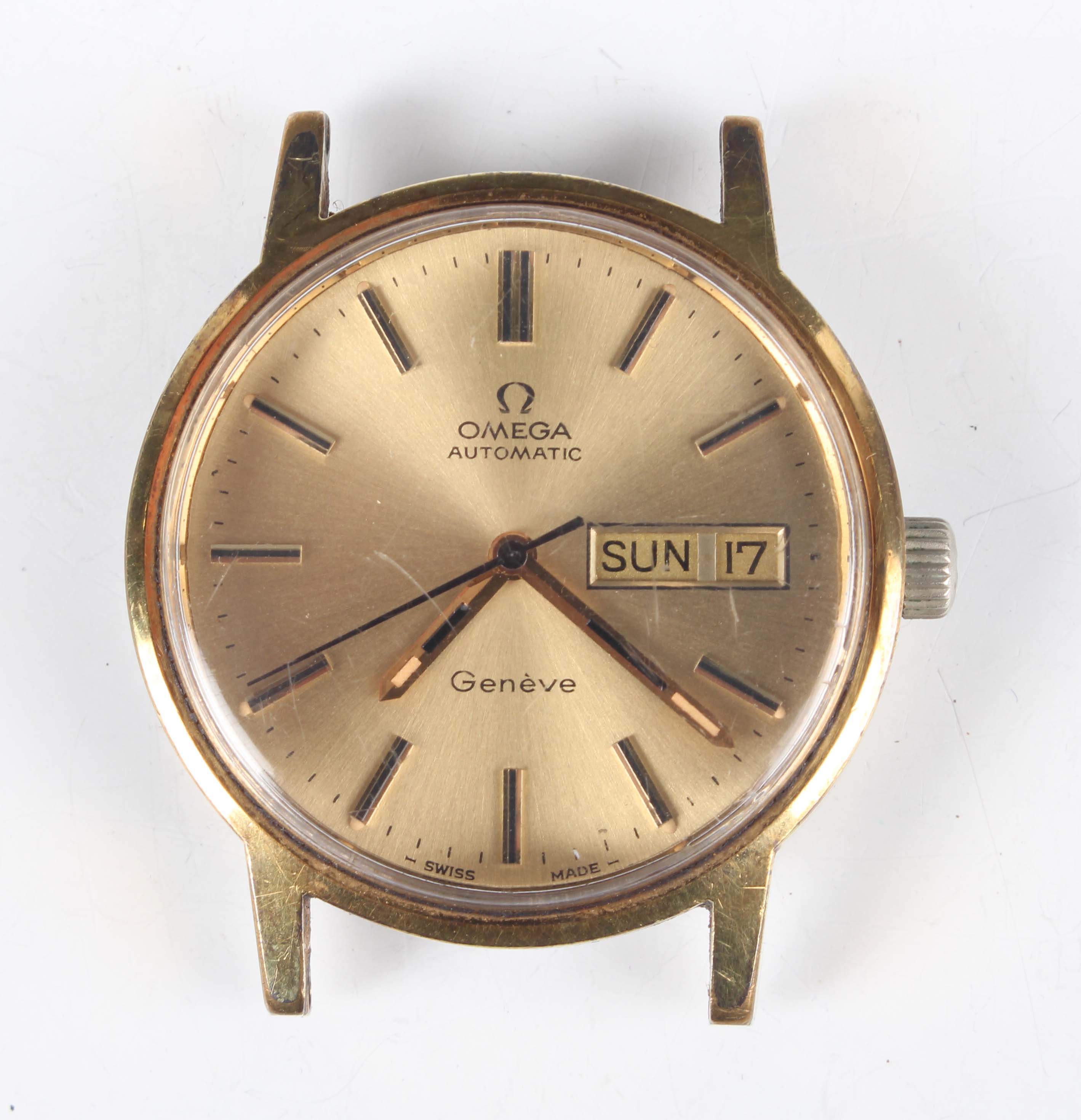 An Omega Automatic gilt metal fronted and steel backed circular cased gentleman's wristwatch, Ref. 166 0117, circa 1972, the signed and jewelled 1022 caliber movement numbered '35515826', the signed gilt dial with baton hour markers, centre seconds and day and date apertures, the signed case back interior numbered '166 0117', case diameter 3.5cm, with Omega buckle (lacking strap).