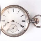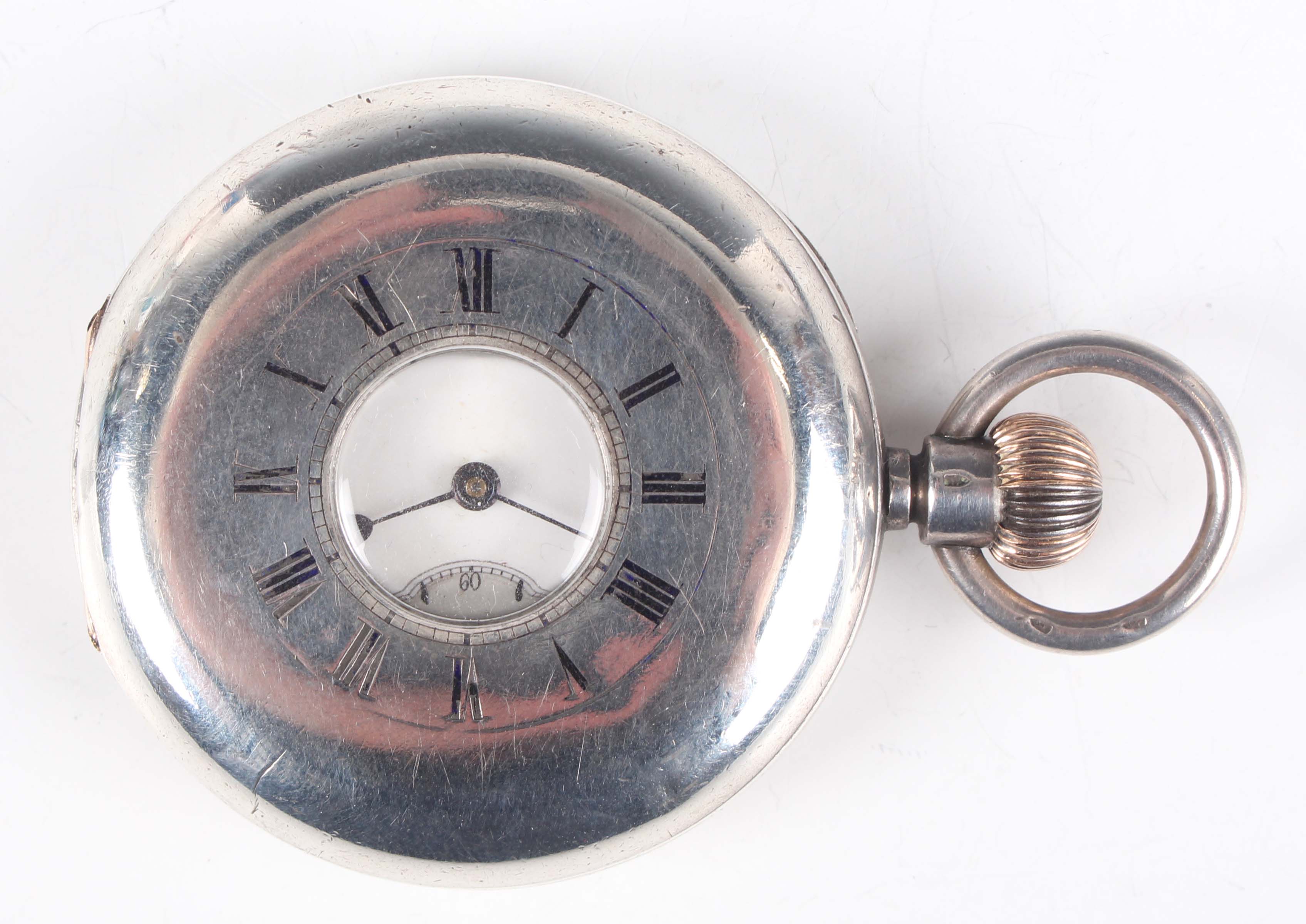 A 0.935 silver half-hunting cased keyless wind gentleman's pocket watch with unsigned gilt lever movement, the unsigned white enamelled dial with black Roman hour numerals and subsidiary seconds, the silver inner case detailed 'Longines Lever Examd by Godwin & Son 304 High Holborn London', total weight 107.6g, case diameter 4.9cm.