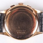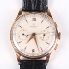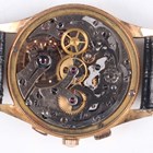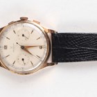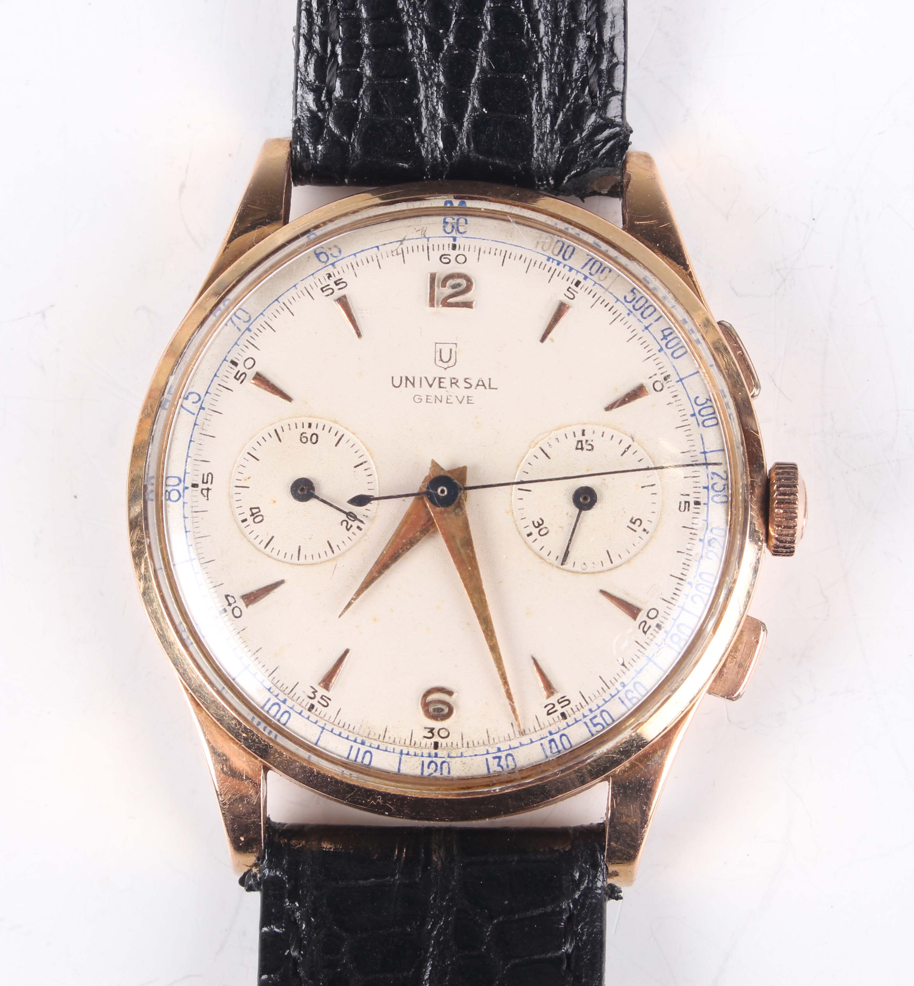 A Universal Uni-Compax 18K gold circular cased gentleman's chronograph wristwatch, Ref. 124103, circa 1940/50s, with signed and jewelled 285 caliber movement, the signed silvered dial with gilt Arabic numeral and arrowhead hour markers, two subsidiary dials and centre stop seconds, the signed case back interior detailed '18K 0,750, the case back numbered '1449145' above '124103', case diameter 3.8cm, on a black leather strap, with a case.