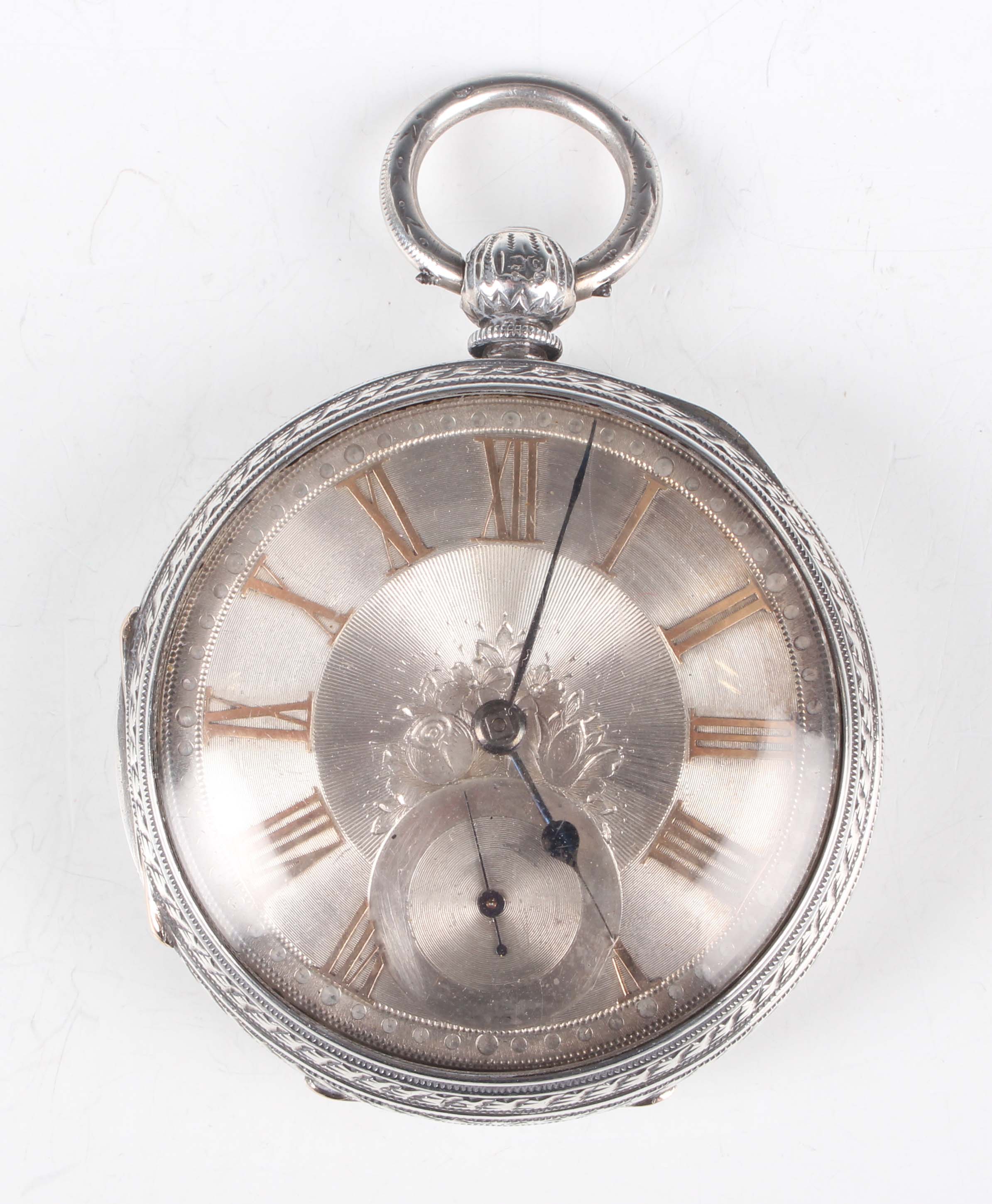 A Victorian silver cased keywind open-faced gentleman's pocket watch with gilt fusee lever movement, the backplate detailed 'C. Wessenberg Cambridge' and numbered '95708', with gilt metal dust cover, the silvered engine turned dial with applied gilt Roman hour numerals and subsidiary seconds, the case with foliate scroll engraved decoration, London 1882, total weight 148.2g, case diameter 5.5cm.